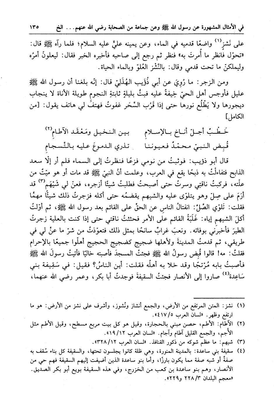 قبض النبي محمد فعيوننا . . . تذري الدموع عليه بالتسجام قال أبو ذؤيب : فوثبت من نومي فزعاً فنظرت إلى السماء فلم أر إلا سعد الذابح فتفاءلت به ذبحا يقع في العرب ، وعلمت أن النبي ( صلى الله عليه وسلم ) قد مات أو هو ميتٌ من علته ، فركبت ناقتي وسرت حتى أصبحت فطلبت شيئا أزجره ، فعن لي شيهمٌ قد أرم على صل وهو يتلوى عليه والشهيم يقضمه حتى أكله فزجرت ذلك شيئا مهما فقلت : تلوي السل : انفتال الناس عن الحق على القائم بعد رسول الله ( صلى الله عليه وسلم ) ، ثم أولت أكل الشيهم إياه : غلبة القائم على الأمر فحثثت ناقتي حتى إذا كنت بالعلية زجرت الطير فأخبرني بوفاته . ونعب غراب سانحا بمثل ذلك فتعوذت من شر ما عن لي في طريقي ، ثم قدمت المدينة ولأهلها ضجيج كضجيج الحجيج أهلوا جميعا بالإحرام فقلت : مه قالوا قبض رسول الله ( صلى الله عليه وسلم ) فجئت المسجد فأصبته خالياً فأتيت رسول الله ( صلى الله عليه وسلم ) فأصبت بابه مرتجا وقد خلا به أهله فقلت : أين الناس ؟ فقيل : في سقيفة بني ساعدة صاروا إلى الأنصار فجئت السقيفة فوجدت أبا بكر ، وعمر رضي الله عنهما ،