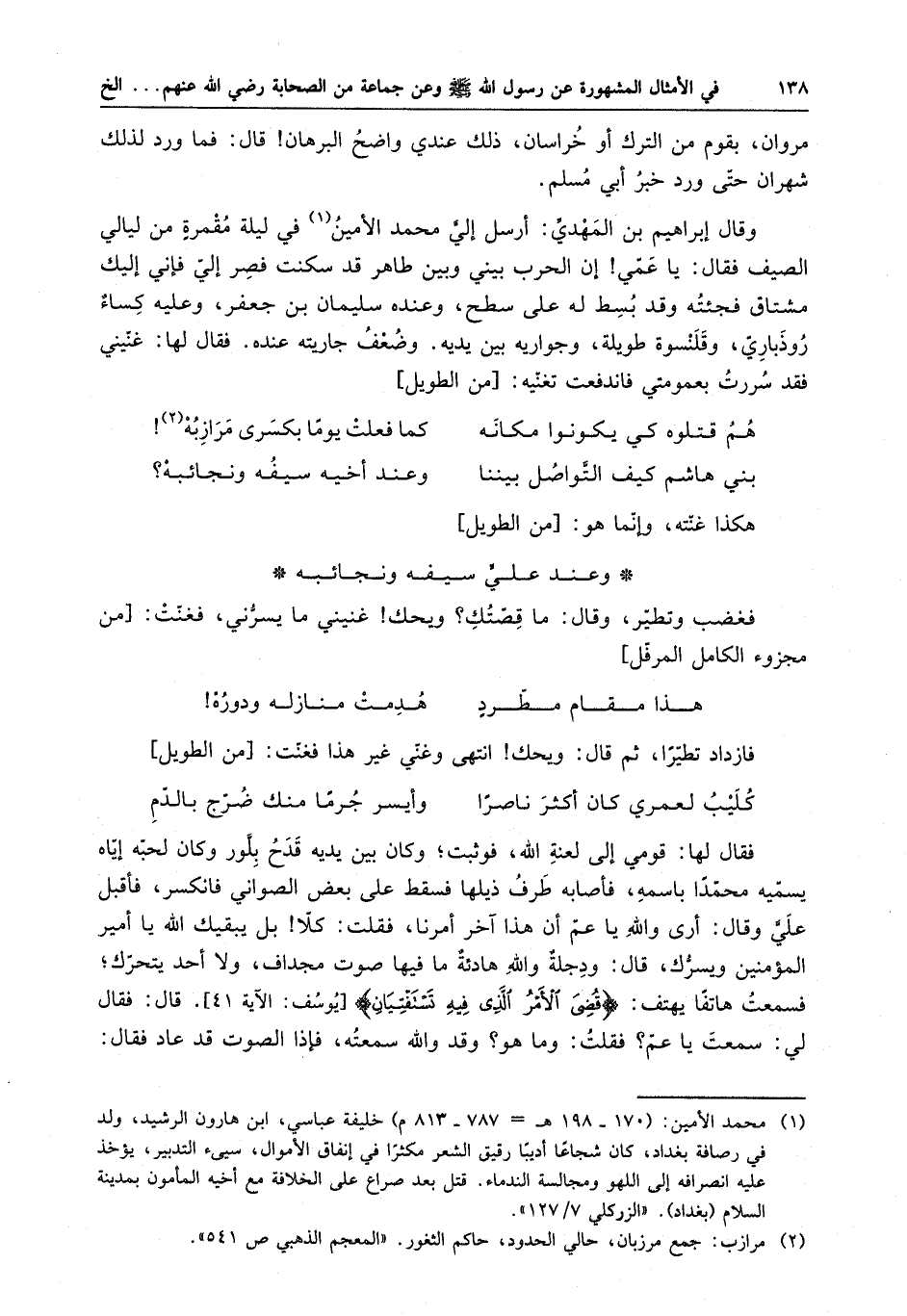 مروان ، بقوم من الترك أو خراسان ، ذلك عندي واضح البرهان قال : فما ورد لذلك شهران حتى ورد خبر أبي مسلم . وقال إبراهيم بن المهدي : أرسل إلى محمد الأمين في ليلة مقمرة من ليالي الصيف فقال : يا عمي إن الحرب بيني وبين طاهر قد سكنت قصر إلي فإني إليك مشتاق فجئته وقد بسط له على سطح ، وعنده سليمان بن جعفر ، وعليه كساءٌ روذباري ، وقلنسوة طويلة ، وجواريه بين يديه وضعف جاريته عنده . فقال لها : غنيني فقد سررت بعمومتي فاندفعت تغنيه :