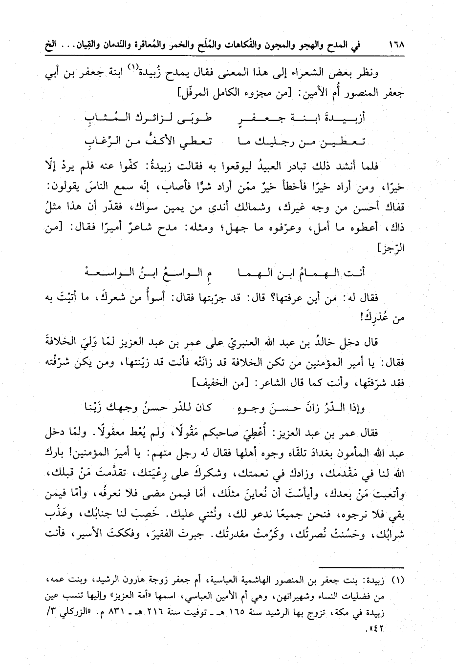 فلما أنشد ذلك تبادر العبيد ليوقعوا به فقالت زبيدة : كفوا عنه فلم يرد إلا خيراً ، ومن أراد خيراً فأخطأ خير ممن أراد شراً فأصاب ، إنه سمع الناس يقولون : قفاك أحسن من وجه غيرك ، وشمالك أندى من يمين سواك ، فقدر أن هذا مثل ذاك ، أعطوه ما أمل ، وعرفوه ما جهل ، ومثله : مدح شاعرٌ أميرا فقال :