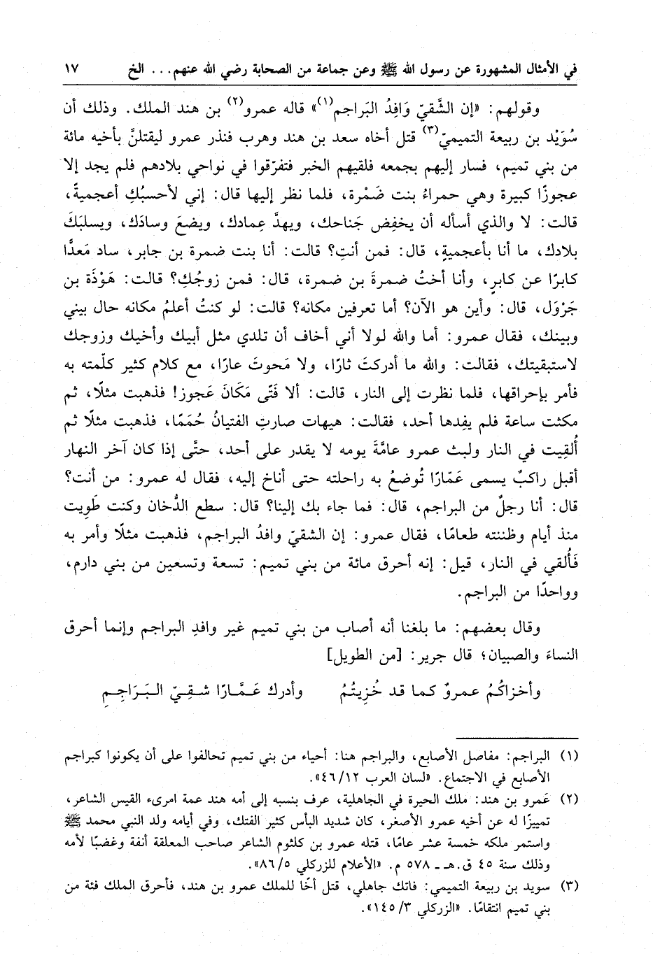 وقولهم : " إن الشقي وافد البراجم " قاله عمرو بن هند الملك . وذلك أن سويد بن ربيعة التميمي قتل أخاه سعد بن هند وهرب فنذر عمرو ليقتلن بأخيه مائة من بني تميم ، فسار إليهم بجمعه فلقيهم الخبر فتفرقوا في نواحي بلادهم فلم يجد إلا عجوزا كبيرة وهي حمراء بنت ضمرة ، فلما نظر إليها قال : إني لأحسبك أعجمية ، قالت : لا والذي أسأله أن يخفض جناحك ، ويهد عمادك ، ويضع وسادك ، ويسلبك بلادك ما أنا بأعجمية ، قال : فمن أنت ؟ قالت : أنا بنت ضمرة بن جابر ، ساد معدا كابرا عن كابر ، وأنا أخت ضمرة بن ضمرة ، قال : فمن زوجك ؟ قالت : هوذة ابن جرول ، قال : وأين هو الآن ؟ أما تعرفين مكانه ؟ قالت : لو كنت أعلم مكانه حال بيني وبينك ، فقال عمرو : أما والله لولا أني أخاف أن تلدي مثل أبيك وأخيك وزوجك لاستبقيتك ، فقالت : والله ما أدركت ثارا ، ولا محوت عارا ، مع كلام كثير كلمته به فأمر بإحراقها ، فلما نظرت إلى النار ، قالت : ألا فتًى مكان عجوز فذهبت مثلا ، ثم مكثت ساعة فلم يفدها أحد ، فقالت : هيهات صارت الفتيان حمماً ، فذهبت مثلا ثم ألقيت في النار ولبث عمرو عامة يومه لا يقدر على أحد ، حتى إذا كان آخر النهار أقبل راكب يسمى عمارا توضع به راحلته حتى أناخ إليه ، فقال له عمرو : من أنت ؟ قال : أنا رجل من البراجم ، قال : فما جاء بك إلينا ؟ قال : سطع الدخان وكنت طويت منذ أيام وظننته طعاما ، فقال عمرو : إن الشقي وافد البراجم ، فذهبت مثلا وأمر به فألقى في النار ، قيل : إنه أحرق مائة من بني تميم : تسعة وتسعين من بني دارم ، وواحدا من البراجم .