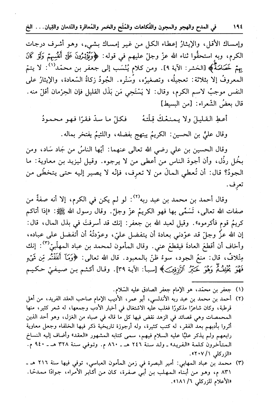 وقال أحمد بن محمد بن عبد ربه : لو لم يكن في الكرم ، إلا أنه صفة من صفات الله تعالى ، تسمى بها فهو الكريم عز وجل . وقال رسول الله ( صلى الله عليه وسلم ) : " إذا أتاكم كريم قوم فأكرموه " . وقيل لعبد الله بن جعفر : إنك قد أسرفت في بذل المال ، قال : إن الله عز وجل قد عودني بعادة أن يتفضل علي ، وعودته أن أتفضل على عباده ، وأخاف أن أقطع العادة فيقطع عني . وقال المأمون لمحمد بن عباد المهلبي : إنك متلاف ، قال : منع الجود ، سوء ظن بالمعبود . قال الله تعالى : " وما أنفقتم من شيءٍ فهو يخلفه وهو خير الرازقين " . وقال أكثم بن صيفي حكيم