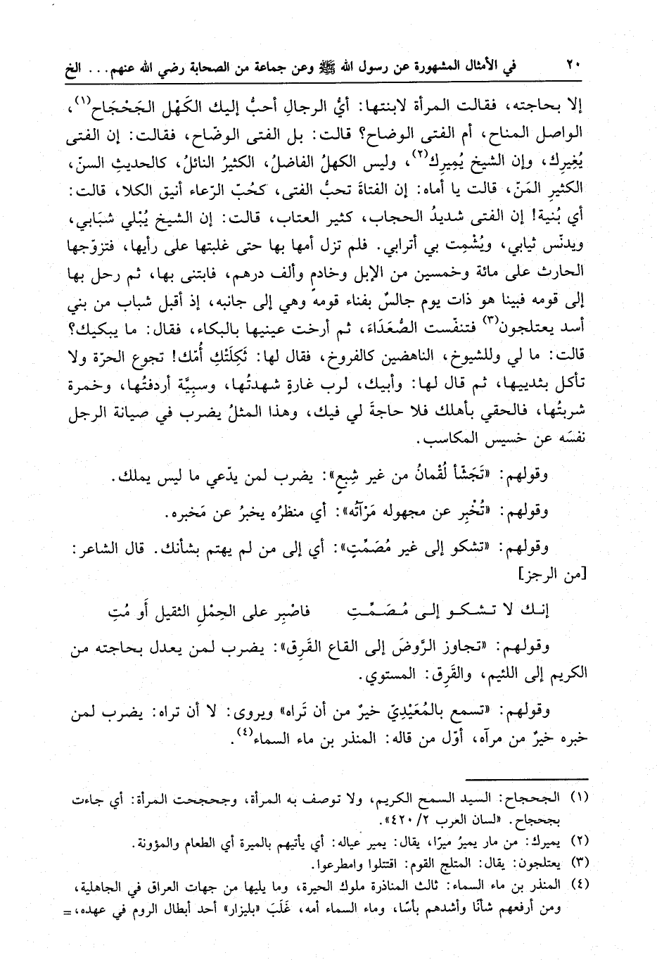 إلا بحاجته ، فقالت المرأة لابنتها : أي الرجال أحب إليك الكهل الجحجاح ، الواصل المناح ، أم الفتى الوضاح ؟ قالت : بل الفتى الوضاح ، فقالت : إن الفتى يغيرك ، وإن الشيخ يميرك ، وليس الكهل الفاضل ، الكثير النائل ، كالحديث السن ، الكثير المن ، قالت يا أماه : إن الفتاة تحب الفتى ، كحب الرعاء أنيق الكلا ، قالت : أي بنيه إن الفتى شديد الحجاب ، كثير العتاب ، قالت : إن الشيخ يبلي شبابي ، ويدنس ثيابي ، ويشمت بي أترابي ، فلم تزل أمها بها حتى غلبتها على رأيها ، فتزوجها الحارث على مائة وخمسين من الإبل وخادم والف درهم ، فابتنى بها ، ثم رحل بها إلى قومه فبينا هو ذات يوم جالس بفناء قومه وهي إلى جانبه ، إذ أقبل شباب من بني أسد يعتلجون فتنفست الصعداء ، ثم أرخت عينيها بالبكاء ، فقال : ما ببكيك ؟ قالت : مالي وللشيوخ ، الناهضين كالفروخ ، فقال لها : ثكلتك أمك تجوع الحرة ولا تأكل بثدييها ، ثم قال لها : وأبيك ، لرب غارة شهدتها ، وسبية أردفتها ، وخمرة شربتها ، فالحقي بأهلك فلا حاجة لي فيك ، وهذا المثل يضرب في صيانة الرجل نفسه عن خسيس المكاسب .