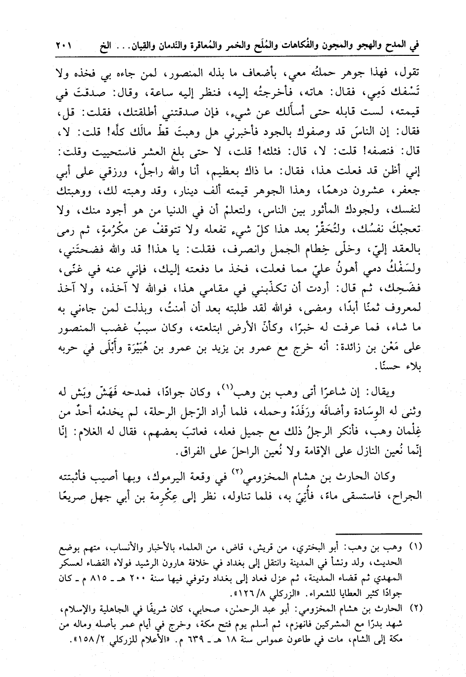 تقول ، فهذا جوهر حملته معي ، بأضعاف ما بذله المنصور ، لمن جاءه بي فخذه ولا تسفك دمي ، فقال : هاته ، فأخرجته إليه ، فنظر إليه ساعة ، وقال : صدقت في قيمته ، لست قابله حتى أسألك عن شيء ، فإن صدقتني أطلقتك ، فقلت : قل ، فقال : إن الناس قد وصفوك بالجود فأخبرني هل وهبت قط مالك كله قلت : لا ، فنصفه قلت : لا ، قال : فثلثه قلت ، لا حتى بلغ العشر فاستحييت وقلت : إني أظن قد فعلت هذا ، فقال : ما ذاك بعظيم ، أنا والله راجل ، ورزقي على أبي جعفر ، عشرون درهما ، وهذا الجوهره قيمته ألف دينار ، وقد وهبته لك ، ووهبتك لنفسك ، ولجودك المأثور بين الناس ، ولتعلم أن في الدنيا من هو أجود منك ، ولا تعجبك نفسك ، ولتحقر بعد هذا كل شيء تفعله ولا تتوقف عن مكرمة ، ثم رمى بالعقد إلي ، وخلي خطام الجمل وانصرف ، فقلت : يا هذا قدو الله فضحتني ، ولسفك دمي أهون علي مما فعلت ، فخذ ما دفعته إليك ، فإني عنه في غنًى ، فضحك ، ثم قال : أردت أن تكذبني في مقامي هذا ، فوالله لا آخذه ، ولا آخذ لمعروف ثمنا أبدا ، ومضى ، فوالله لقد طلبته بعد أن أمنت ، وبذلت لمن جاءني به ما شاء ، فما عرفت له خبرا ، وكأن الأر ابتلعته ، وكان سبب غضب المنصور على معن ابن زائدة : أنه خرج مع عمرو بن يزيد بن عمرو بن هبيرة وأبلى في حربه بلاء حسنا .