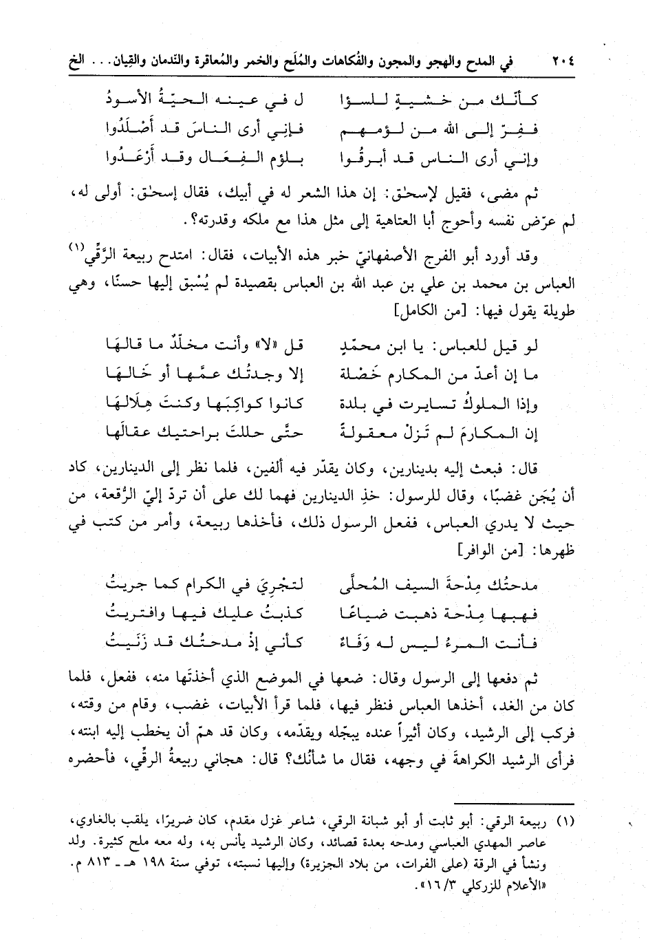أنت المرء ليس له وفاءٌ . . . كأني إذ مدحتك قد زنيت ثم دفعها إلى الرسول وقال : ضعها في الموضع الذي أخذتها منه ، ففعل ، فلما كان من الغد ، أخذها العباس فنظر فيها ، فلما قرأ الأبيات ، غضب ، وقام من وقته ، فركب إلى الرشيد ، وكان أثيرا عنده يبجله ويقدمه ، وكان قد هم أن يخطب إليه ابنته ، فرأى الرشيد الكراهة في وجهه ، فقال ما شأنك ؟ قال : هجاني ربيعة الرقى ، فأحضره