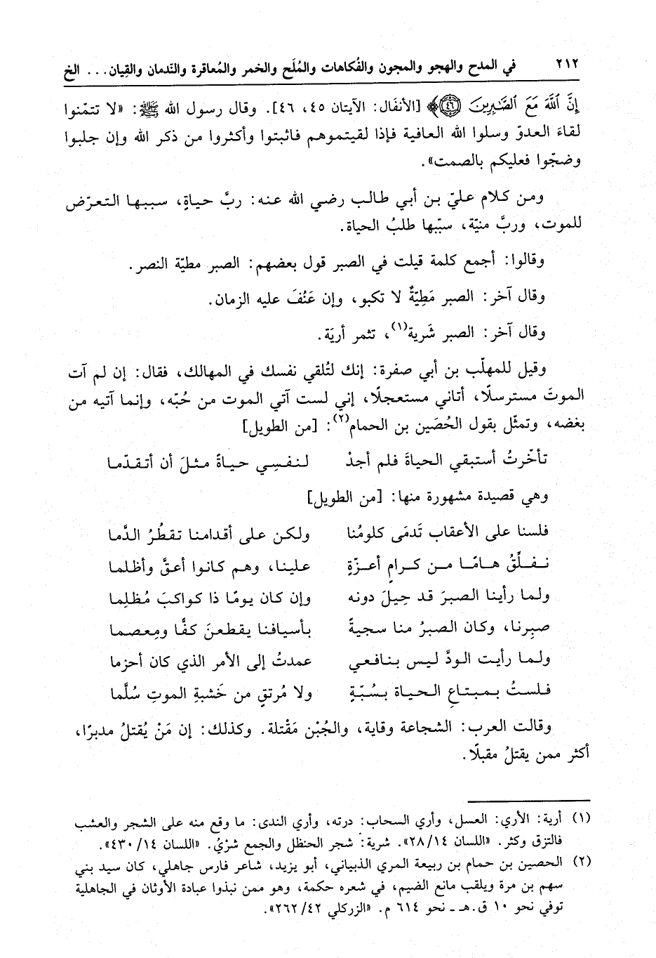 وقيل للمهلب بن أبي صفرة : إنك لتلقي نفسك في المهالك ، فقال : إن لم آت الموت مسترسلا ، أتاني مستعجلا ، إني لست آتي الموت من حبه ، وإنما آتيه من بغضه ، وتمثل بقول الحصين بن الحمام :