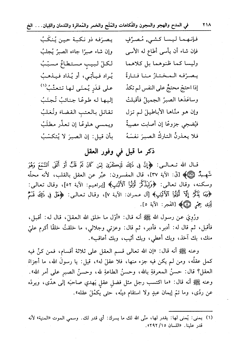 وإن هو مناها الأباطيل لم تزل . . . تقاتل بالعتب القضاء وتغلب فيضحي جزوعا إن أصابت مصيبةٌ . . . ويمسي هلوعا إن تعذر مطلب
