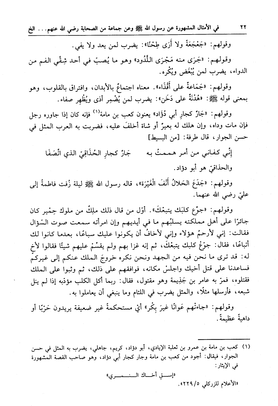 وقولهم : " جار كجار أبي دؤاد " يعنون كعب بن مامة فإنه كان إذا جاوره رجل فإن مات وداه ، وإن هلك له بعير أو شاة أخلف عليه ، فضربت به العرب المثل في حسن الجوار ، قال طرفة