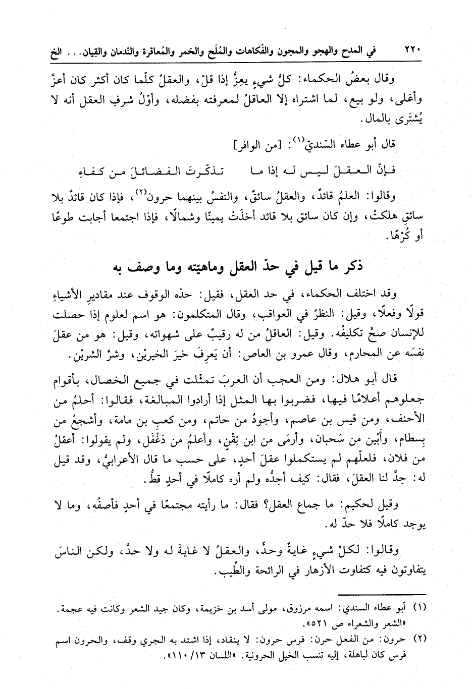 وقد اختلف الحكماء ، في حد العقل ، فقيل : حده الوقوف عند مقادير الأشياء قولا وفعلا ، وقيل : النظر في العواقب ، وقال المتكلمون : هو اسم لعلوم إذا حصلت للإنسان صح تكليفه . وقيل : العاقل من له رقيب على شهواته ، وقيل : هو من عقل نفسه عن المحارم ، وقال عمرو بن العاص : أن يعرف خير الخيرين ، وشر الشرين . قال أبو هلال : ومن العجب أن العرب تمثلت في جميع الخصال ، بأقوام جعلوهم أعلاما فيها ، فضربوا بها المثل إذا أرادوا المبالغة ، فقالوا : أحلم من الأحنف ، ومن قيس بن عاصم ، وأجود من حاتم ، ومن كعب بن مامة ، وأشجع من بسطام ، وأبي من سحبان ، وأرمي من ابن تقنٍ ، وأعلم من دغفل ، ولم يقولوا : أعقل من فلان ، فلعلهم لم يستكملوا عقل أحدٍ ، على حسب ما قال الأعرابي ، وقد قيل له : حد لا العقل ، فقال : كيف أحده ولم أره كاملا في أحدٍ قط .