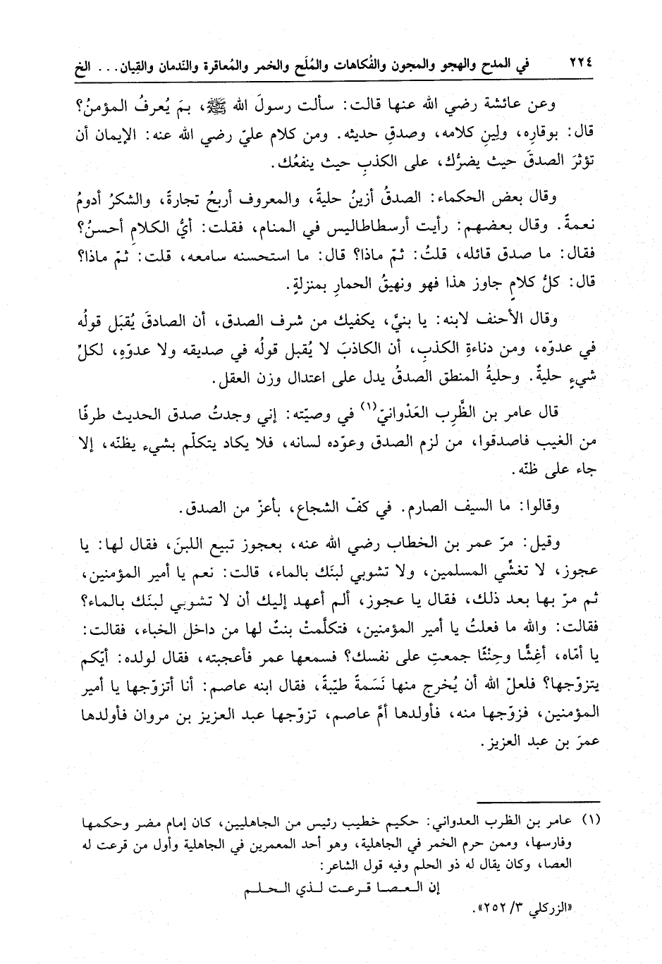 قال عامر بن الظرب العدواني في وصيته : إني وجدت صدق الحديث طرفا من الغيب فاصدقوا ، من لزم الصدق وعوده لسانه ، فلا يكاد يتكلم بشيء يظنه إلا جاء على ظنه .