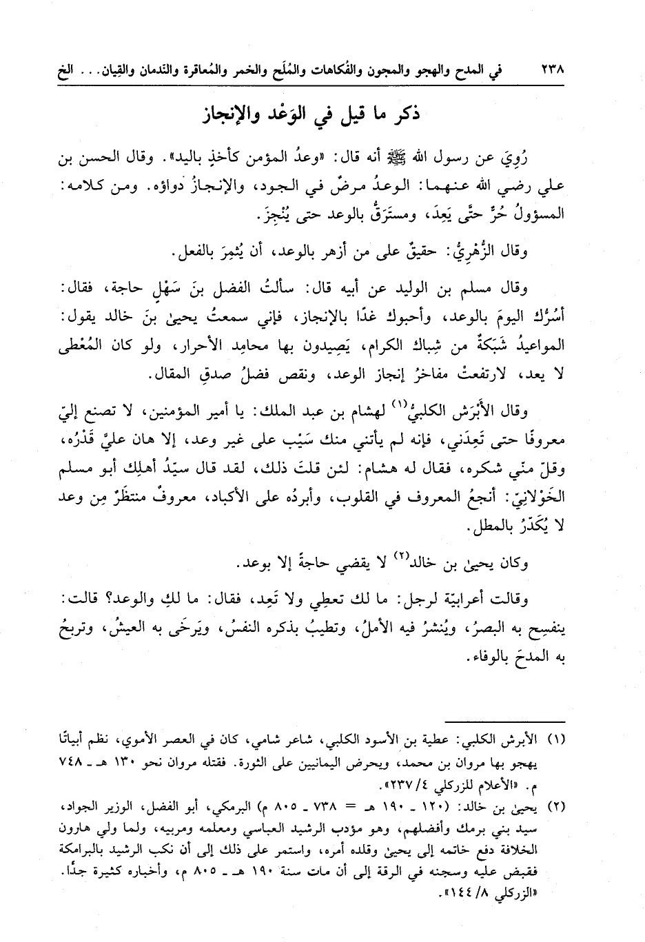 وقال الزهري : حقيق على من أزهر بالوعد ، أن يثمر بالفعل . وقال مسلم بن الوليد عن أبيه قال : سألت الفضل بن سهلٍ حاجة ، فقال : أشرفك اليوم بالوعد ، وأحبوك غدا بالإنجاز ، فإني سمعت يحيى بن خالد يقول : المواعيد شبكة من شباك الكرام ، يصيدون بها محامد الأحرار ، ولو كان المعطي لا يعد ، لارتفعت مفاخر إنجاز الوعد ، ونقص فضل صدق المقال .