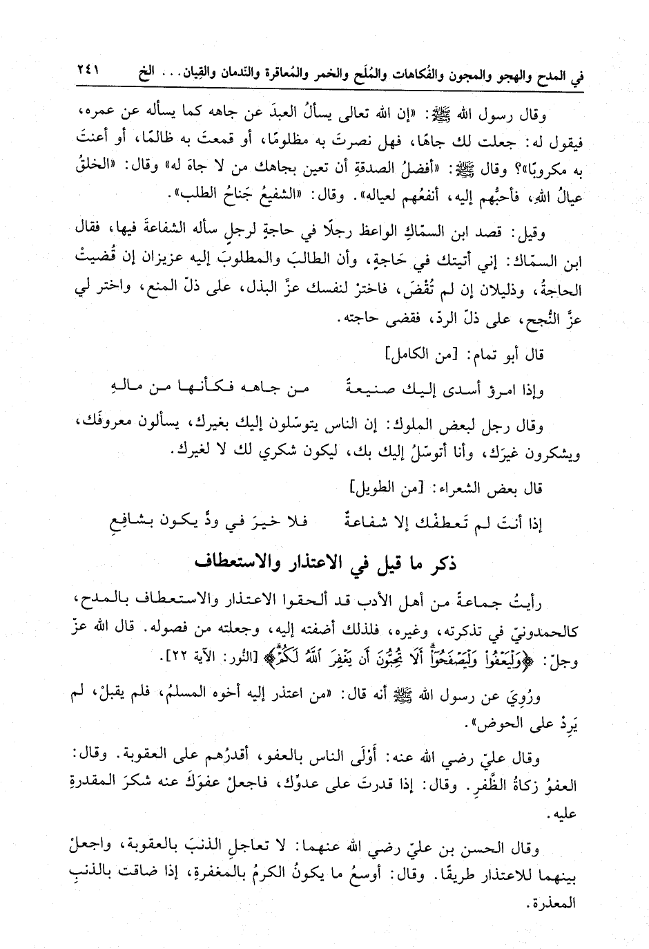 رأيت جماعةً من أهل الأدب قد ألحقوا الاعتذار والاستعطاف بالمدح ، كالحمدوني في تذكرته ، وغيره ، فلذلك أضفته إليه ، وجعلته من فصوله . قال الله عز وجل : " وليعفوا وليصفحوا ألا تحبون أن يغفر الله لكم " .