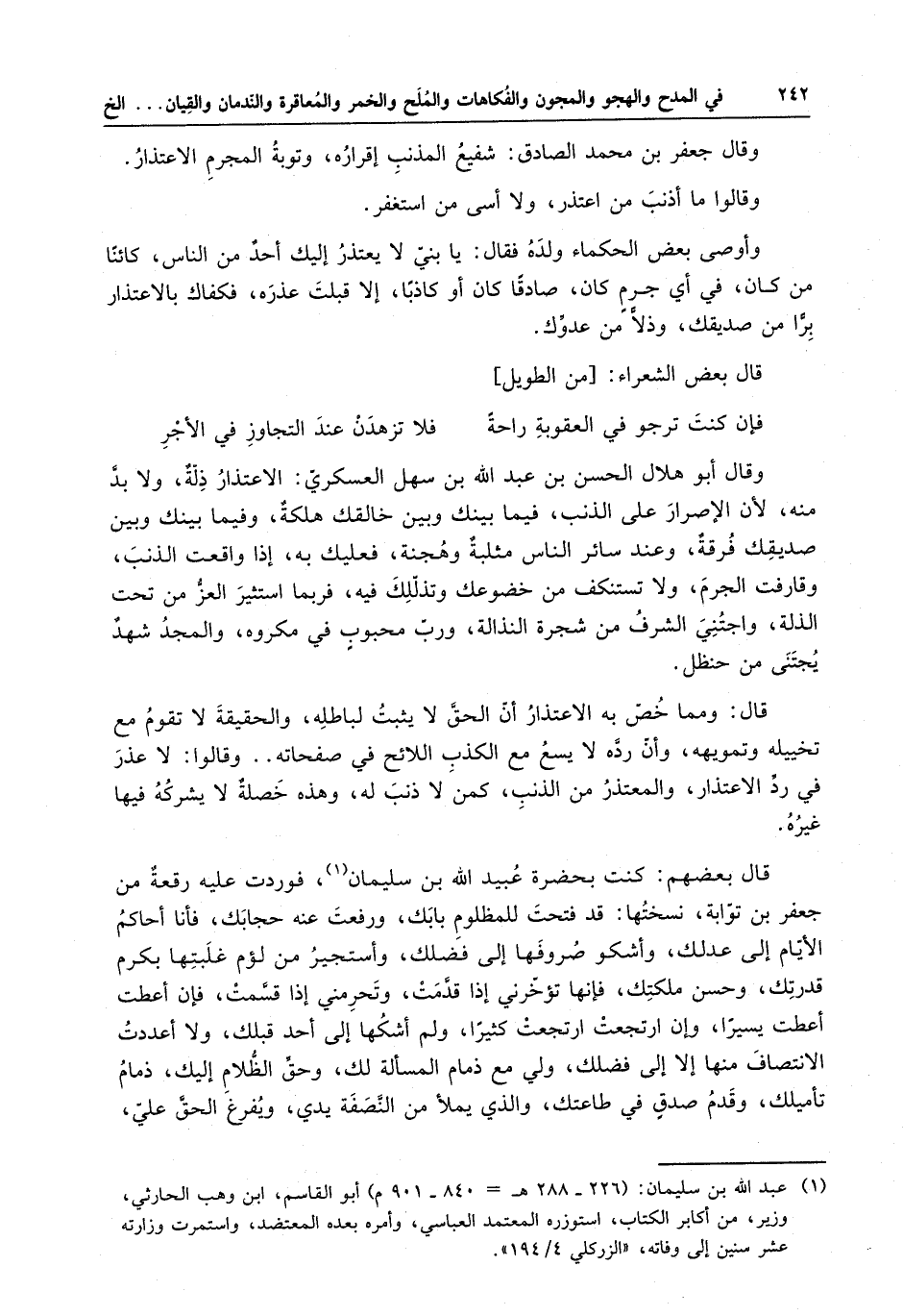 قال : ومما خص به الاعتذار أن الحق لا يثبت لباطله ، والحقيقة لا تقوم مع تخييله وتمويهه ، وأن رده لا يسع مع الكذب اللائح في صفحاته . وقالوا : لا عذر في رد الاعتذار ، والمعتذر من الذنب ، كمن لا ذنب له ، وهذه خصلة لا يشركه فيها غيره . قال بعضهم : كنت بحضرة عبيد الله بن سليمان ، فوردت عليه رقعة من جعفر ابن توابة ، نسختها : قد فتحت للمظلوم بابك ، ورفعت عنه حجابك ، فأنا أحاكم الأيام إلى عدلك ، وأشكو صروفها إلى فضلك ، وأستجير من لؤم غلبتها بكرم قدرتك ، وحسن ملكتك ، فإنها تؤخرني إذا قدمت ، وتحرمني إذا قسمت ، فإن أعطت أعطت يسيرا ، وإن ارتجعت ارتجعت كثيرا ، ولم أشكها إلى أحد قبلك ، ولا أعددت الانتصاف منها إلا إلى فضلك ، ولي مع ذمام المسألة لك ، وحق الظلام إليك ، ذمام تأميلك ، وقدم صدقٍ في طاعتك ، والذي يملأ من النصفة يدي ، ويفرغ الحق علي ،