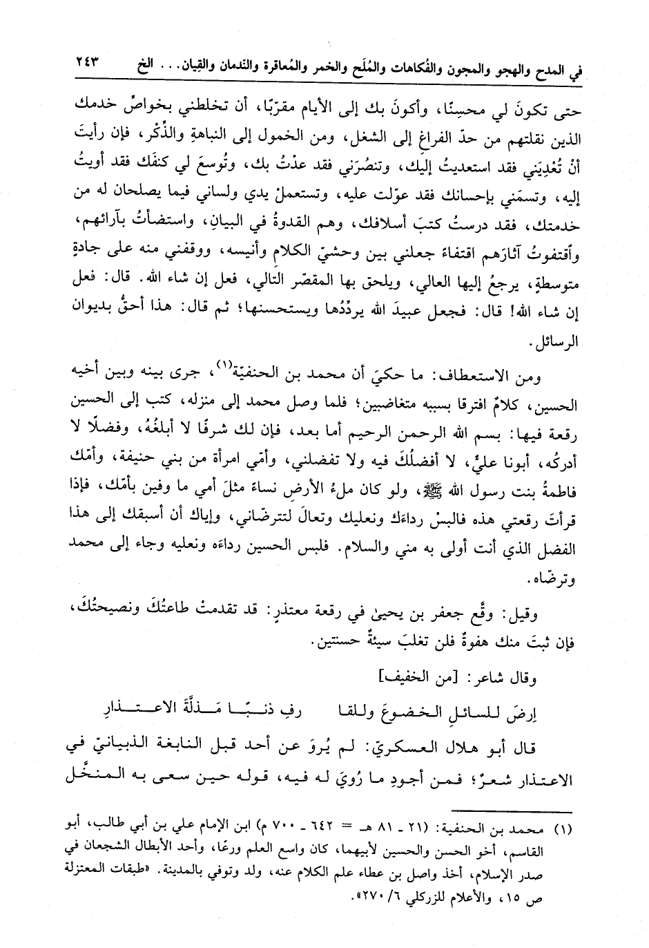ومن الاستعطاف : ما حكي أن محمد بن الحنفية ، جرى بينه وبين أخيه الحسين ، كلام افترقا بسببه متغاضبين ، فلما وصل محمد إلى منزله ، كتب إلى الحسين رقعة فيها : بسم الله الرحمن الرحيم أما بعد ، فإن لك شرفا لا أبلغه ، وفضلا لا أدركه ، أبونا عليٌّ ، لا أفضلك فيه ولا تفضلني ، وأمي امرأة من بني حنيفة ، وأمك فاطمة بنت رسول الله ( صلى الله عليه وسلم ) ، ولو كان ملء الأرض نساءً مثل أمي ما وفين بأمك ، فإذا قرأت رقعتي هذه فالبس رداءك ونعليك وتعال لتترضاني ، وإياك أن أسبقك إلى هذا الفضل الذي أنت أولى به مني والسلام . فلبس الحسين رداءه ونعليه وجاء إلى محمد وترضاه .