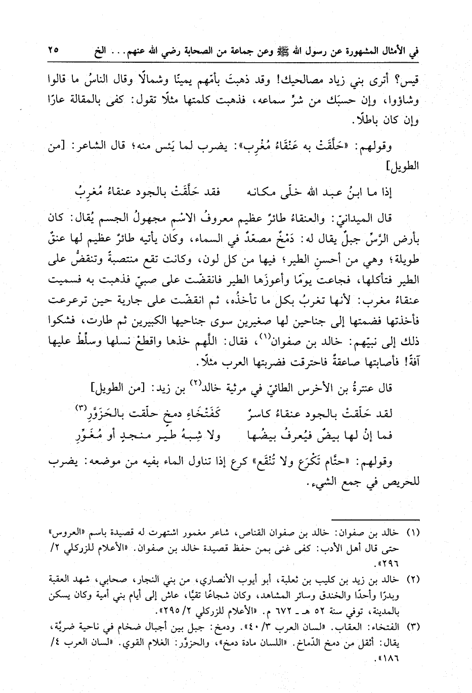 قال الميداني : والعنقاء طائر عظيم معروف الاسم مجهول الجسم يقال : كان بأرض الرس جبل يقال له : دمخ مصعد في السماء ، وكان يأتيه طائر عظيم لها عنق طويلة ، وهي من أحسن الطير ، فيها من كل لون ، وكانت تقع منتصبة وتنقض على الطير فتأكلها ، فجاعت يوما وأعوزها الطير فانقضت على صبي فذهبت به فسميت عنقاء مغرب : لأنها تغرب بكل ما تأخذه ، ثم انقضت على جارية حين ترعرعت فأخذتها فضمتها إلى جناحين لها صغيرين سوى جناحيها الكبيرين ثم طارت ، فشكوا ذلك إلى نبيهم : خالد بن صفوان ، فقال : اللهم خذها واقطع نسلها وسلط عليها آفة فأصابتها صاعقة فاحترقت فضربتها العرب مثلا .