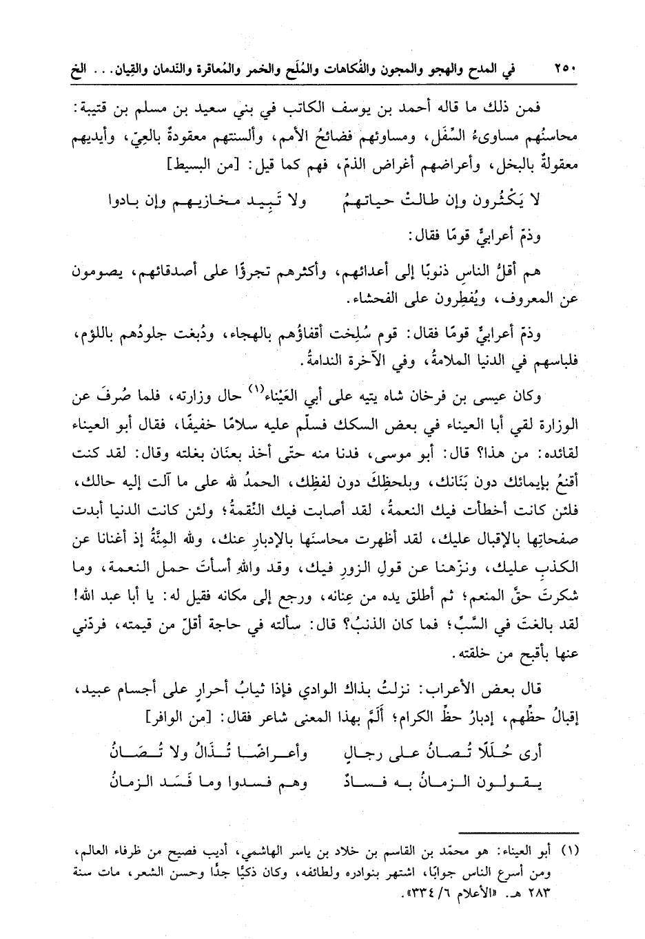 وذم أعرابي قوما فقال : قوم سلخت أقفاؤهم بالهجاء ، ودبغت جلودهم باللؤم ، فلباسهم في الدنيا الملامة ، وفي الآخرة الندامة . وكان عيسى بن فرخان شاه يتيه على أبي العيناء حال وزارته ، فلما صرف عن الوزارة لقي أبا العيناء في بعض السكك فسلم عليه سلاما خفيفا ، فقال أبو العيناء لقائده : من هذا ؟ قال : أبو موسى ، فدنا منه حتى أخذ بعنان بغلته وقال : لقد كنت أقنع بإيمائك دون بنانك ، وبلحظك دون لفظك ، الحمد لله على ما آلت إليه حالك ، فلئن كانت أخطأت فيك النعمة ، لقد أصابت فيك النقمة ، ولئن كانت الدنيا أبدت صفحاتها بالإقبال عليك ، لقد أظهرت محاسنها بالإدبار عنك ، ولله المنة إذا أغنانا عن الكذب عليك ، ونزهنا عن قول الزور فيك ، وقد والله أسأت حمل النعمة ، وما شكرت حق المنعم ، ثم أطلق يده من عنانه ، ورجع إلى مكانه فقيل له : يا أبا عبد الله لقد بالغت في السب ، فما كان الذنب ؟ قال : سألته في حاجة أقل من قيمته ، فردني عنها بأقبح من خلقته .