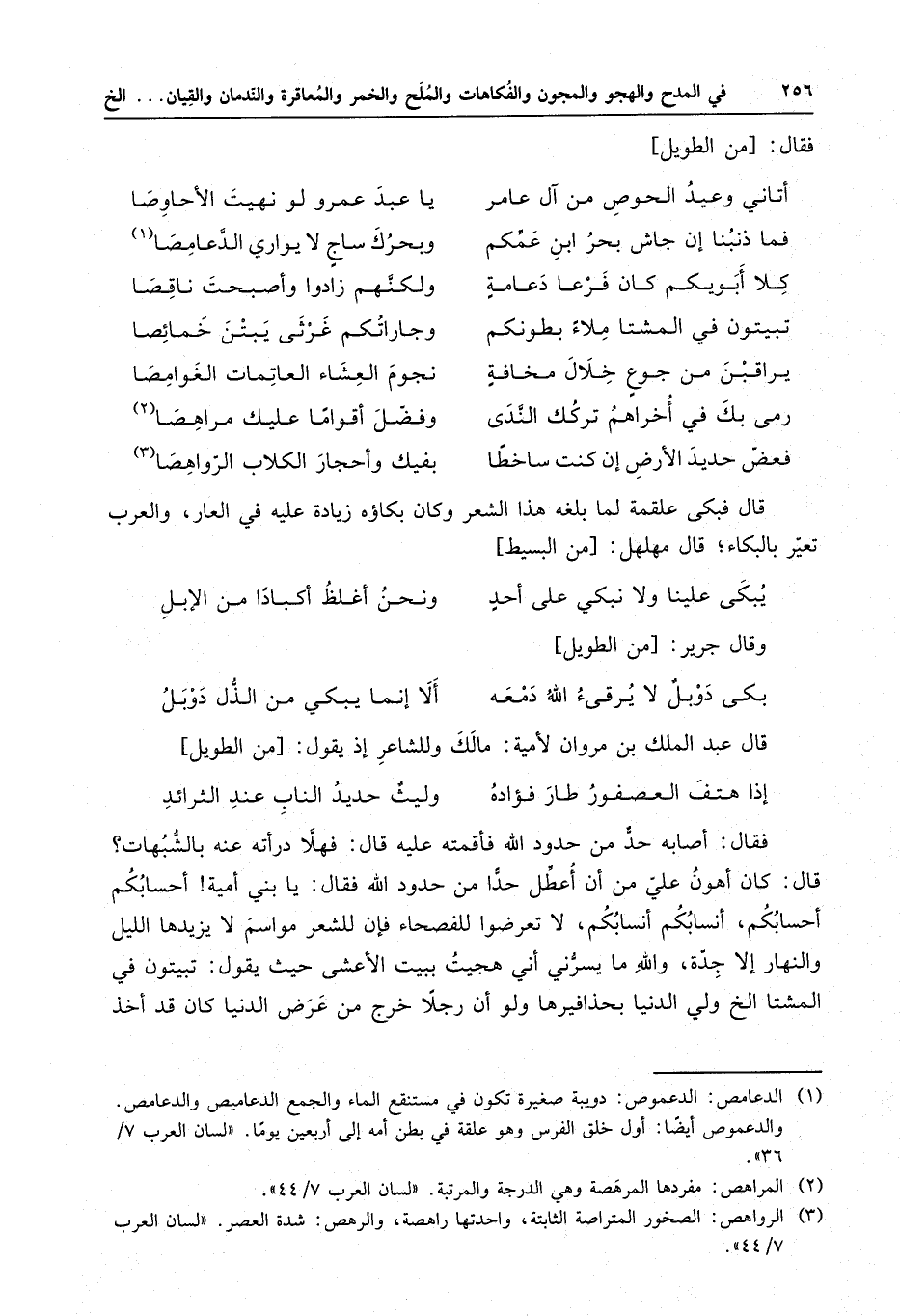 فقال : أصابه حد من حدود الله فأقمته عليه قال : فهلا درأته عنه بالشهبات ؟ قال : كان أهون علي من أن أعطل حدا من حدود الله فقال : يا بني أمية أحسابكم أحسابكم ، أنسابكم أنسابكم ، لا تعرضوا للفصحاء فإن الشعر مواسم لا يزيدها الليل والنهار إلا جدة ، والله ما يسرني أني هجيت ببيت الأعشى حيث يقول : تبيتون في المشتا الخ ولي الدنيا بحذافيرها ولو أن رجلا خرج من عرض الدنيا كان قد أخذ
