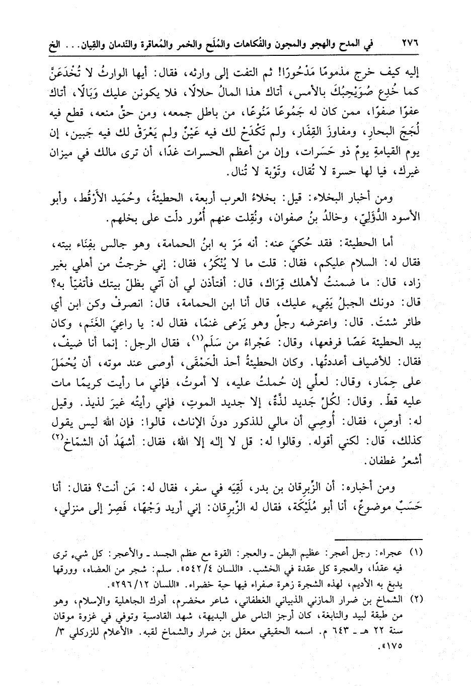 أما الحطيئة : فقد حكي عنه : أنه مر به ابن الحمامة ، وهو جالس بفناء بيته ، فقال له : السلام عليكم ، فقال : قلت ما لا ينكر ، فقال : إني خرجت من أهلي بغير زاد ، قال : ما ضمنت لأهلك قراك ، قال : أفتأذن لي أن آتي بظل بيتك فأتفيأ به ؟ قال : دونك الجبل يفيء عليك ، قال أنا ابن الحمامة ، قال : انصرف وكن ابن أي طائر شئت . قال : واعترضه رجل وهو يرعى غنما ، فقال له : يا راعي الغنم ، وكان بيد الحطيئة عصاً فرفعها ، وقال : عجراء من سلم ، فقال الرجل : إنما أنا ضيف ، فقال : للأضياف أعددتها . وكان الحطيئة أحد الحمقى ، أوصى عند موته ، أن يحمل على حمار ، وقال : لعلي إن حملت عليه ، لا أموت ، فإني ما رأيت كريما مات عليه قط وقال : لكل جديد لذيذ إلا جديد الموت فإني رأيته غير لذيذ . وقيل له : أوص ، فقال : أوصي أن مالي للذكور دون الإناث ، قالوا : فإن الله ليس يقول كذلك ، قال : لكني أقوله . وقالوا له : قل لا إله إلا الله ، فقال : أشهد أن الشماخ أشعر غطفان .