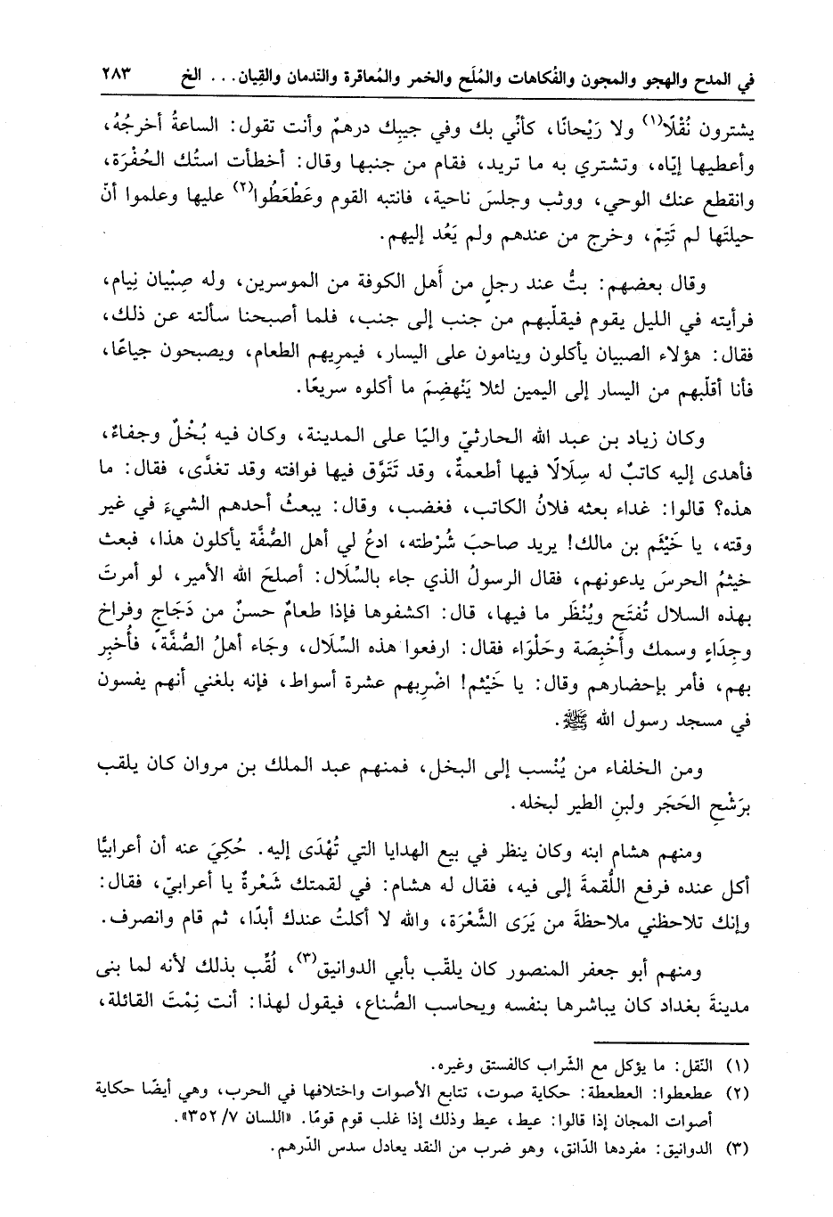 ومنهم هشام ابنه وكان ينظر في بيع الهدايا التي تهدي إليه . حكي عنه أن أعرابياً أكل عنده فرفع اللقمة إلى فيه ، فقال له هشام : في لقمتك شعرة يا أعرابي ، فقال : وإنك تلاحظني ملاحظة من يرى الشعرة ، والله لا أكلت عندك أبدا ، ثم قام وانصرف . ومنهم أبو جعفر المنصور كان يلقب بأبي الدوانيق ، لقب بذلك لأنه لما بني مدينة بغداد كان يباشرها بنفسه ويحاسب الصناع ، فيقول لهذا : أنت نمت القائلة ،