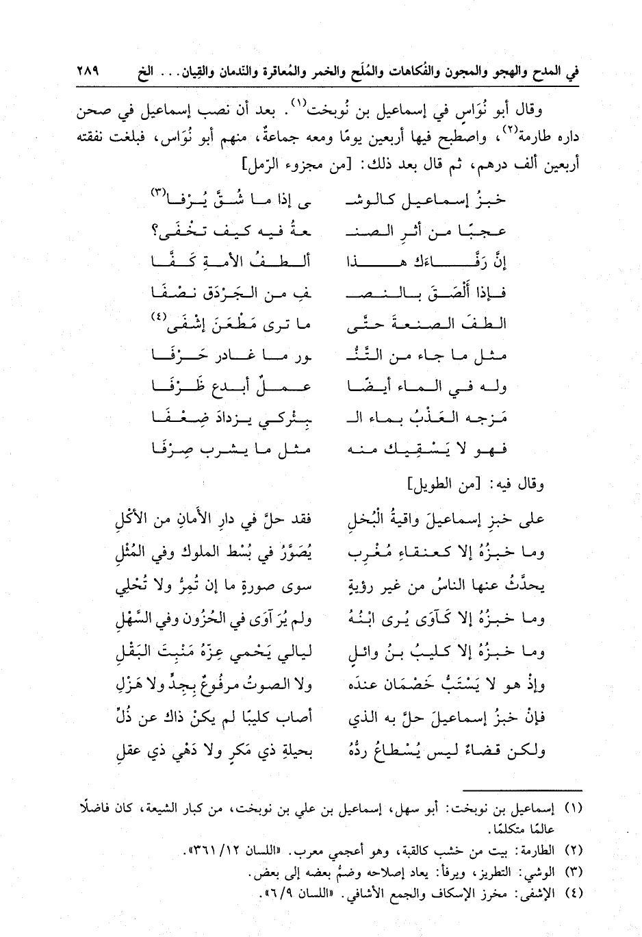 وقال أبو نواس في إسماعيل بن نوبخت ، بعد أن نصب إسماعيل في صحن داره طارمه ، وآصطبح فيها أربعين يوما ومعه جماعة . منهم أبو نواس ، فبلغت نفقته أربعين ألف درهم ، ثم قال بعد ذلك