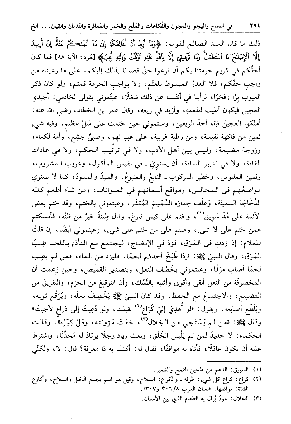 ذلك ما قال العبد الصالح لقومه : وما أريد أن أخالفكم إلى ما أنهاكم عنه إن أريد إلا الإصلاح ما استطعت وما توفيقي إلا بالله عليه توكلت وإليه أنيب . فما كان أحقكم في كريم حرمتنا بكم أن ترعوا حق قصدنا بذلك إليكم ، على ما رعيناه من واجب حقكم ، فلا العذر المبسوط بلغتم ، ولا بواجب الحرمة قمتم ، ولو كان ذكر العيوب براً وفخرا ، لرأينا في أنفسنا عن ذلك شغلا ، عبتموني بقولي لخادمي : أجيدي العجين فيكون أطيب لطعمه ، وأزيد في ريعه ، وقال عمر بن الخطاب رضي الله عنه : أملكوا العجين فإنه أحد الريعين ، وعبتموني حين ختمت على سل عظيم ، وفيه شيء ثمين من فاكهة نفيسة ، ومن رطبة غريبة ، على عبدٍ نهمٍ ، وصبي جشع ، وأمه لكعاء ، وزوجة مضيعة ، وليس بين أهل الأدب ، ولا في ترتيب الحكم ، ولا في عادات القادة ، ولا في تدبير السادة ، أن يستوي في نفيس المأكول ، وغريب المشروب ، وثمين الملبوس ، وخطير المركوب التابع والمتبوع ، والسيد والمسود ، كما لا تستوي مواضعهم في المجالس ، ومواقع أسمائهم في العنوانات ، ومن شاء أطعم كلبه الدجاجة السمينة ، وعلف حماره السمسم المقشر ، وعبتموني بالختم ، وقد ختم بعض الأئمة على مد سويق ، وختم على كيس فارغ ، وقال طينة خير من ظنه ، فأمسكتم عمن ختم على لا شيء ، وعبتم على من ختم على شيء ، وعبتموني أيضا ، أن قلت للغلام : إذا زدت في المرق ، فزد في الإنضاج ، ليجتمع مع التأدم باللحم طيب المرق ، وقال النبي ( صلى الله عليه وسلم ) : " إذا طبخ أحدكم لحما ، فليزد من الماء ، فمن لم يصب لحما أصاب مرقا " . وعبتموني بخصف النعل ، وبتصدير القميص ، وحين زعمت أن المخصوفة من النعل أبقى وأقوى وأشبه بالنسك ، وأن الترفيع من الحزم ، والتفريق من التضييع ، والاجتماع مع الحفظ ، وقد كان النبي ( صلى الله عليه وسلم ) يخصف نعله ، ويرقع ثوبه ، ويلطع أصابعه ، ويقول : " لو أهدي إلى كراع لقبلت ، ولو دعيت إلى ذراع لأجبت " . وقال ( صلى الله عليه وسلم ) : " من لم يستحي من الخلال ، خفت مؤنته ، وقل كبره " . وقالت الحكماء : لا جديد لمن لم يلبس الخلق ، وبعث زياد رجلا يرتاد له محدثا ، واشترط عليه أن يكون عاقلا ، فأتاه به موافقا ، فقال له : أكنت به ذا معرفة ؟ قال : لا ، ولكني