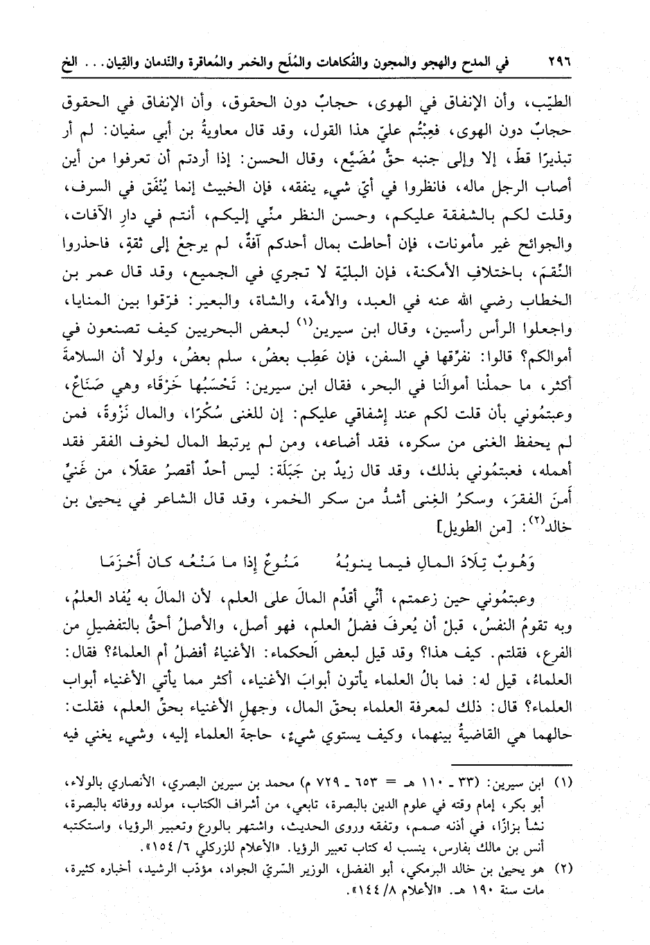 الطيب ، وأن الإنفاق في الهوى ، حجاب دون الحقوق ، وأن الإنفاق في الحقوق حجاب دون الهوى ، فعبتم علي هذا القول ، وقد قال معاوية بن أبي سفيان : لم أر تبذيرا قط ، إلا وإلى جنبه حقٌ مضيع ، وقال الحسن : إذا أردتم أن تعرفوا من أين أصاب الرجل ماله ، فانظروا في أي شيء ينفقه ، فإن الخبيث إنما ينفق في السرف ، وقلت لكم بالشفقة عليكم ، وحسن النظر مني إليكم ، أنتم في دار الآفات ، والجوائح غير مأمونات ، فإن أحاطت بمال أحدكم آفةٌ ، لم يرجع إلى ثقة ، فاحذروا النقم ، باختلاف الأمكنة ، فإن البلية لا تجري في الجميع ، وقد قال عمر بن الخطاب رضي الله عنه في العبد ، والأمة ، والشاة ، والبعير : فرقوا بين المنايا ، واجعلوا الرأس رأسين ، وقال ابن سيرين لبعض البحريين : كيف تصنعون في أموالكم ؟ قالوا : نفرقها في السفن ، فإن عطب بعض ، سلم بعض ، ولولا أن السلامة أكثر ، ما حملنا أموالنا في البحر ، فقال ابن سيرين : تحسبها خرقاء وهي صناعٌ ، وعبتموني بأن قلت لكم عند إشفاقي عليكم : إن للغنى سكرا ، والمال نزوةً ، فمن لم يحفظ الغنى من سكره ، فقد أضاعه ، ومن لم يرتبط المال لخوف الفقر فقد أهمله ، فعبتموني بذلك ، وقد قال زيد بن جبلة : ليس أحدٌ أقصر عقلا ، من غنى أمن الفقر ، وسكر الغنى أشد من سكر الخمر ، وقد قال الشاعر في يحيى ابن خالد : رن أحد بطول عمره ، وتقويس ظهره ، ورقة عظمه ، ووهن قوته ، وأن برى دخله أكثر من رزقه فيدعوه ذلك إلى إخراج ماله من يده ، وتحويله إلى ملك غيره ، أو تحكيم السرف فيه ، وتسليط الشهوات عليه ، فلعله أن يكون معمرا وهو لا يدري وممدودا له في السن وهو لا يشعر ، ولعله أن يرزق الولد على اليأس ، وتحدث عليه آفات الكبر ما لا يخطر على باله ، ولا يدركه عقله ، فيسترده ممن لا يرده ، ويظهر الشكوى إلى من لا يرحمه ، أضعف ما كان عن الطلب ، وأقبح ما كان له أن يطلب ، فعبتموني بذلك ، وقال عمرو بن العاص : اعمل لدنياك عمل من يعيش أبدا ، واعمل لآخرتك عمل من يموت غدا ، وعبتموني بأن قلت : إن التلف والتبذير إلى مال المواريث ، وأموال الملوك ، وإن الحفظ إلى المال المكتسب ، والغنى المجتلب ، وإلى ما يعرض فيه بذهاب الدين ، واهتضام العرض ، ونصب البدن ، واهتمام القلب أسرع ، ومن لم يحسب نفقته لم يحسب دخله ، ومن لم يحسب الدخل فقد أضاع المال ، ومن لم يعرف للغنى قدره فقد أذن بالفقر ، وطاب نفسا بالذل ، وعبتموني بأن زعمت أن كسب الحلال ، مضمنٌ بالإنفاق في الحلال ، وأن الخبيث ينزع إلى الخبيث ، وأن الطيب يدعو إلى الطيب ، وأن الإنفاق في الهوى ، حجاب دون الحقوق ، وأن الإنفاق في الحقوق حجاب دون الهوى ، فعبتم علي هذا القول ، وقد قال معاوية بن أبي سفيان : لم أر تبذيرا قط ، إلا وإلى جنبه حقٌ مضيع ، وقال الحسن : إذا أردتم أن تعرفوا من أين أصاب الرجل ماله ، فانظروا في أي شيء ينفقه ، فإن الخبيث إنما ينفق في السرف ، وقلت لكم بالشفقة عليكم ، وحسن النظر مني إليكم ، أنتم في دار الآفات ، والجوائح غير مأمونات ، فإن أحاطت بمال أحدكم آفةٌ ، لم يرجع إلى ثقة ، فاحذروا النقم ، باختلاف الأمكنة ، فإن البلية لا تجري في الجميع ، وقد قال عمر بن الخطاب رضي الله عنه في العبد ، والأمة ، والشاة ، والبعير : فرقوا بين المنايا ، واجعلوا الرأس رأسين ، وقال ابن سيرين لبعض البحريين : كيف تصنعون في أموالكم ؟ قالوا : نفرقها في السفن ، فإن عطب بعض ، سلم بعض ، ولولا أن السلامة أكثر ، ما حملنا أموالنا في البحر ، فقال ابن سيرين : تحسبها خرقاء وهي صناعٌ ، وعبتموني بأن قلت لكم عند إشفاقي عليكم : إن للغنى سكرا ، والمال نزوةً ، فمن لم يحفظ الغنى من سكره ، فقد أضاعه ، ومن لم يرتبط المال لخوف الفقر فقد أهمله ، فعبتموني بذلك ، وقد قال زيد بن جبلة : ليس أحدٌ أقصر عقلا ، من غنى أمن الفقر ، وسكر الغنى أشد من سكر الخمر ، وقد قال الشاعر في يحيى ابن خالد : وهوبٌ تلاد المال فيما ينوبه . . . منوعٌ إذا ما منعه كان أحزما