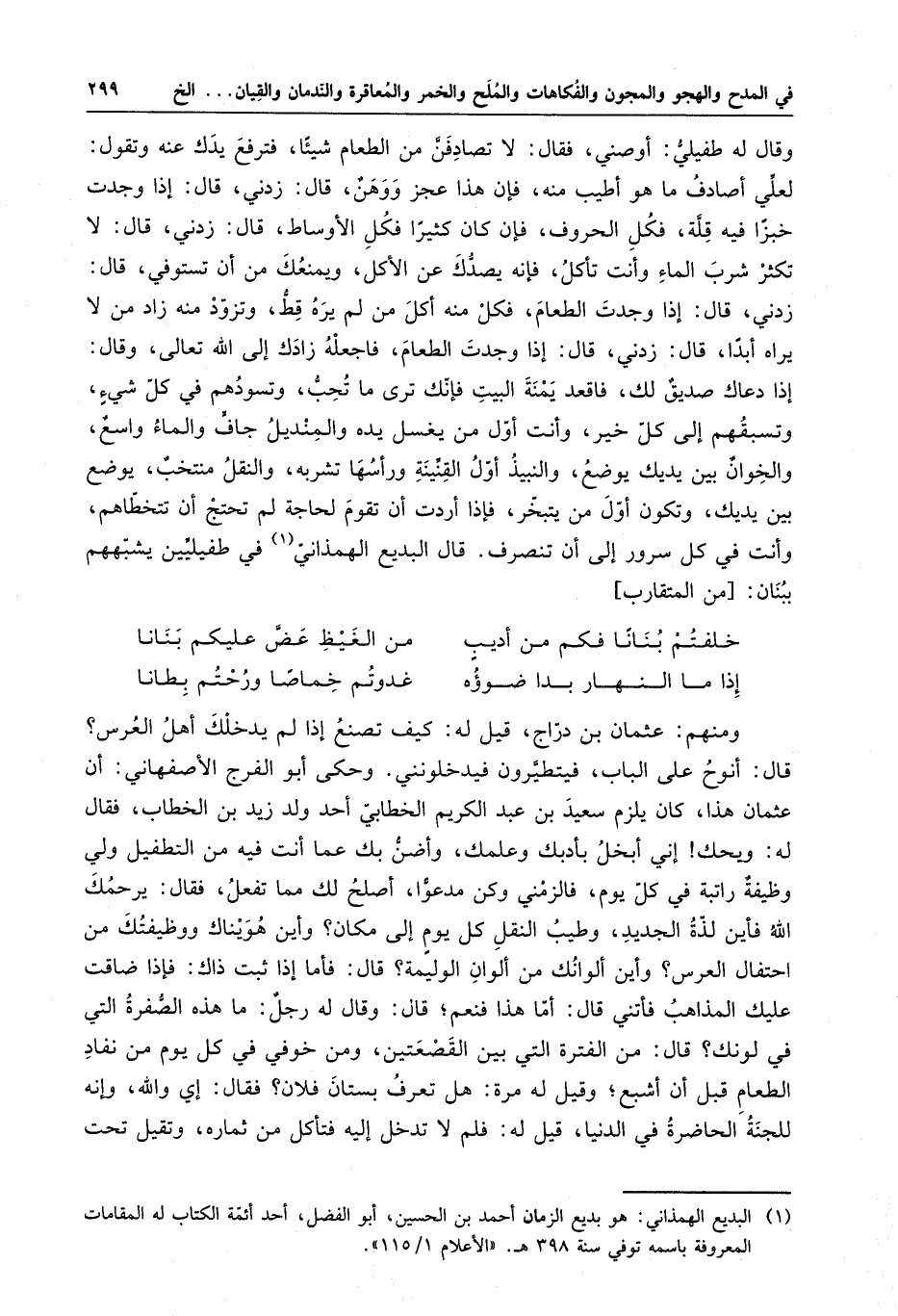 وقال له طفيليٌّ : أوصني ، فقال : لا تصادفن من الطعام شيئا ، فترفع يدك عنه وتقول : لعلي أصادف ما هو أطيب منه ، فإن هذا عجز ووهنٌ ، قال : زدني ، قال : إذا وجدت خبزا فيه قلة ، فكل الحروف ، فإن كان كثيرا فكل الأوساط ، قال : زدني قال : لا تكثر شرب الماء وأنت تأكل ، فإنه يصدك عن الأكل ، ويمنعك من أن تستوفي ، قال : زدني ، قال : إذا وجدت الطعام ، فكل منه أكل من لم يره قط ، وتزود منه زاد من لا يراه أبدا ، قال : زدني ، قال : إذا وجدت الطعام ، فاجعله زادك إلى الله تعالى ، وقال : إذا دعاك صديق لك ، فاقعد يمنة البيت فإنك ترى ما تحب ، وتسودهم في كل شيء ، وتسبقهم إلى كل خير ، وأنت أول من يغسل يده والمنديل جاف ، والماء واسع ، والخوان بين يديك يوضع ، والنبيذ أول القنينة ، ورأسها تشربه ، والنقل منتخب ، يوضع بين يديك ، وتكون أول من يتبخر ، فإذا أردت أن تقوم لحاجة لم تحتج أن تتخطاهم ، وأنت في كل سرور إلى أن تنصرف . قال البديع الهمذاني في طفيليين يشبههم ببنان :