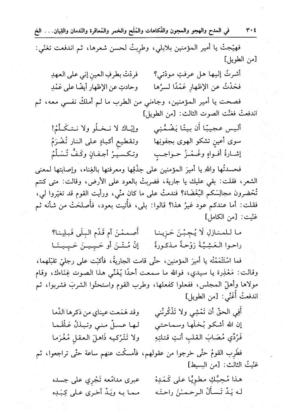 فهيجت يا أمير المؤمنين بلابلي ، وطربت لحسن شعرها ، ثم اندفعت تغني :