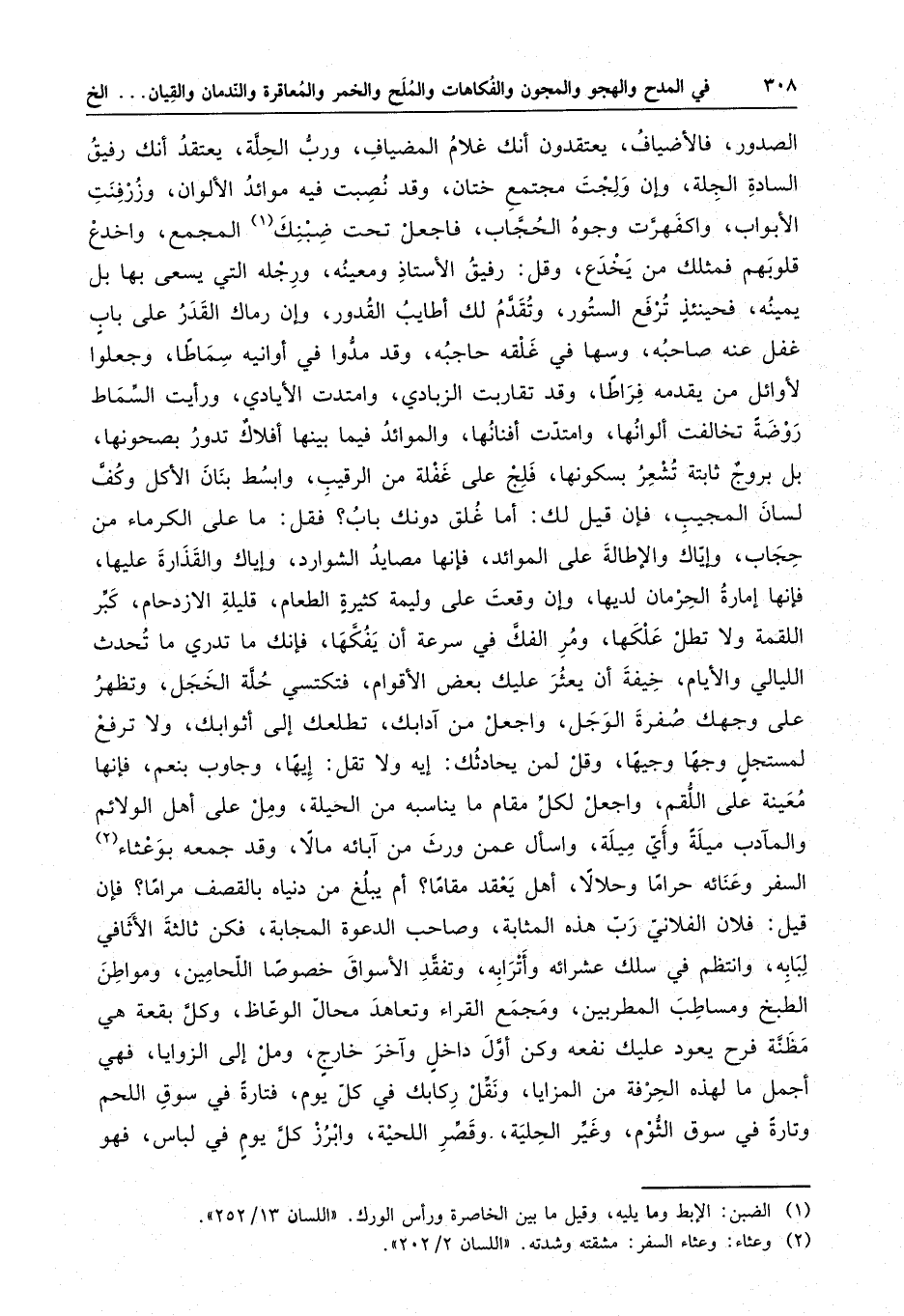 الصدور ، فالأضياف ، يعتقدون أنك غلام المضياف ، ورب الحلة ، يعتقد أنك رفيق السادة الجلة ، وإن ولجت مجتمع ختان ، وقد نصبت فيه موائد الألوان ، وذرفنت الأبواب ، واكفهرت وجوه الحجاب ، فاجعل تحت ضبنك المجمع ، واخدع قلوبهم فمثلك من يخدع ، وقل : رفيق الأستاذ ومعينه ، ورجله التي يسعى بها بل يمينه ، فحينئذ ترفع الستور ، وتقدم لك أطايب القدور ، وإن رماك القدر على باب غفل عنه صاحبه ، وسها في غلقة حاجبه ، وقد مدوا في أوانيه سماطا ، وجعلوا لأوائل من يقدمه فراطا ، وقد تقاربت الزبادي ، وامتدت الأيادي ، ورأيت السماط روضةً تخالفت ألوانها ، وامتدت أفنانها ، والموائد فيما بينها أفلاكٌ تدور بصحونها ، بل بروج ثابتة تشعر بسكونها ، فلج على غفلة من الرقيب ، وابسط بنان الأكل وكف لسان المجيب ، فإن قيل لك : أما غلق دونك باب ؟ فقل : ما على الكرماء من حجاب ، وإياك والإطالة على الموائد ، فإنها مصايد الشوارد ، وإياك والقذارة عليها ، فإنها إمارة الحرمان لديها ، وإن وقعت على وليمة كثيرة الطعام ، قليلة الازدحام ، كبر اللقمة ولا تطل علكها ، ومر الفك في سرعة أن يفكها ، فإنك ما تدري ما تحدث الليالي والأيام ، خيفة أن يعثر عليك بعض الأقوام ، فتكتسي حلة الخجل ، وتظهر على وجهك صفرة الوجل ، واجعل من آدابك ، تطلعك إلى أثوابها ، ولا ترفع لمستجل وجها وجيها ، وقل لمن يحادثك : إيه ولا تقل : إيها ، وجاوب بنعم ، فإنها معينة على اللقم ، واجعل لكل مقام ما يناسبه من الحيلة ، ومل على أهل الولائم والمآدب ميلةً وأي ميلة ، واسأل عمن ورث من آبائه مالا ، وقد جمعه بوعثاء السفر وعنائه حراما وحلالا ، أهل يعقد مقاما ؟ أم يبلغ من دنياه بالقصف مراما ؟ فإن قيل : فلان الفلاني رب هذه المثابة ، وصاحب الدعوة المجابة ، فكن ثالثة الأثافي لبابه ، وانتظم في سلك عشرائه وأترابه ، وتفقد الأسواق خصوصا اللحامين ، ومواطن الطبخ ومساطب المطر بين ، ومجمع القراء ومعاهد محال الوعاظ ، وكل بقعة هي مظنة فرح يعود عليك نفعه وكن أول داخل وآخر خارج ، ومل إلى الزوايا ، فهي أجمل ما لهذه الحرفة من المزايا ، ونقل ركابك في كل يوم ، فتارة في سوق اللحم وتارة في سوق الثوم ، وغير الحلية ، وقصر اللحية ، وابرز كل يوم في لباس ، فهو