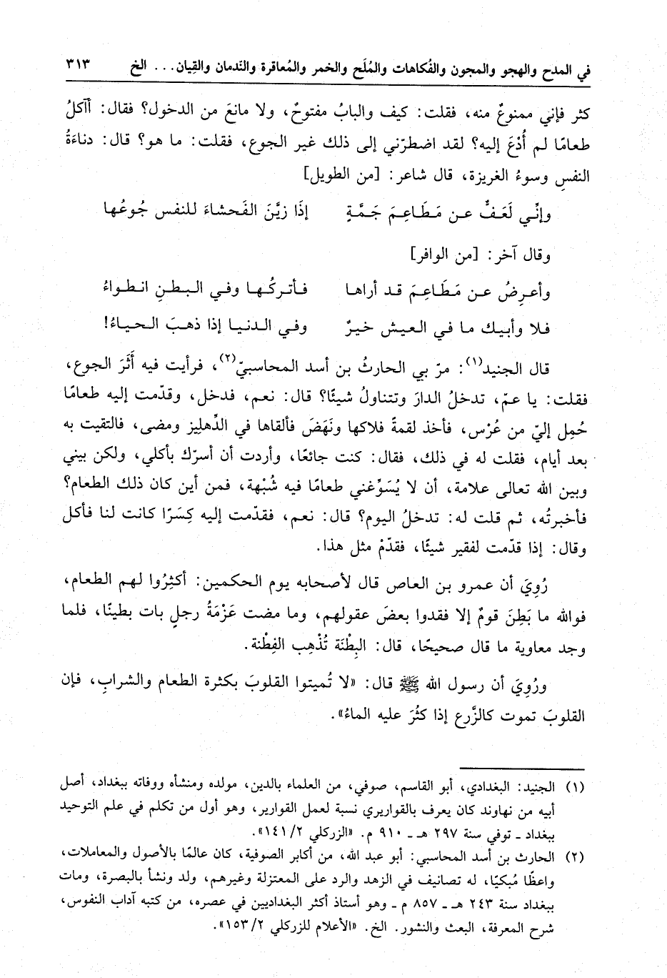 قال الجنيد : مر بي الحارث بن أسد المحاسبي ، فرأيت فيه أثر الجوع ، فقلت : يا عم ، تدخل الدار وتتناول شيئا ؟ قال : نعم ، فدخل ، وقدمت إليه طعاما حمل إلي من عرس ، فأخذ لقمة فلاكها ونهض فألقاها في الدهليز ومضى ، فالتقيت به بعد أيام ، فقلت له في ذلك : فقال : كنت جائعا ، وأردت أن أسرك بأكلي ، ولكن بيني وبين الله تعالى علامة ، أن لا يسوغني طعاما فيه شبهة ، فمن أين كان ذلك الطعام ؟ فأخبرته ، ثم قلت له : تدخل اليوم ؟ قال : نعم ، فقدمت إليه كسراً كانت لنا فأكل وقال : إذا قدمت لفقير شيئا ، فقدم مثل هذا .