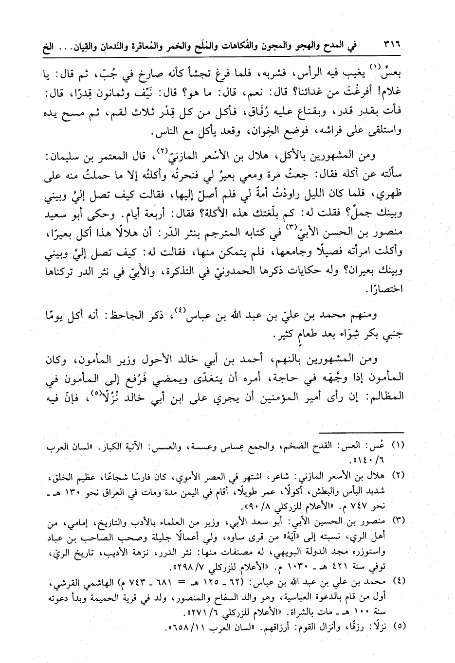 ومنهم محمد بن علي بن عبد الله بن عباس ، ذكر الجاحظ : أنه أكل يوما جنبي بكر شواء بعد طعام كثير . ومن المشهورين بالنهم ، أحمد بن أبي خالد الأحول وزير المأمون ، وكان المأمون إذا وجهه في حاجة ، أمره أن يتغدى ويمضي فرفع إلى المأمون في المظالم : إن رأى أمير المؤمنين أن يجري على ابن أبي خالد نزلا ، فإن فيه