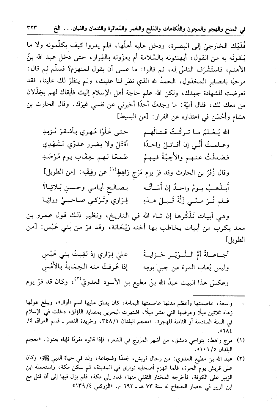 فديك الخارجي إلى البصرة ، ودخل عليه أهلها ، فلم يدروا كيف يكلمونه ولا ما يلقونه به من القول ، أيهنئونه بالسلامة أم يعزونه بالفرار ، حتى دخل عبد الله ابن الأهتم ، فاستشرف الناس له ، ثم قالوا : ما عسى أن يقول لمنهزم ؟ فسلم ثم قال : مرحبا بالصابر المخذول ، الحمد لله الذي نظر لنا عليك ، ولم ينظر لك علينا ، فقد تعرضت للشهادة جهدك ، ولكن الله علم حاجة أهل الإسلام إليك فأبقاك لهم بخذلان من معك لك ، فقال أمية : ما وجدت أحدا أخبرني عن نفسي غيرك . وقال الحارث بن هشام وأحسن في اعتذاره عن الفرار :