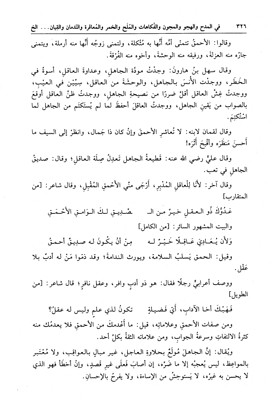 ويقال : إن الجاهل مولعٌ بحلاوة العاجل ، غير مبالٍ بالعواقب ، ولا معتبر بالمواعظ ، ليس يعجبه إلا ما ضره ، إن أصاب فعلى غير قصدٍ ، وإن أخطأ فهو الذي لا يحسن به غيره ، لا يستوحش من الإساءة ، ولا يفرح بالإحسان .