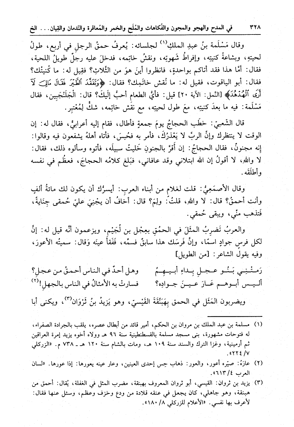 وقال مسلمة بن عبد الملك لجلسائه : يعرف حمق الرجل في أربع ، طول لحيته ، وبشاعة كنيته ، وإفراط شهوته ، ونقش خاتمه ، فدخل عليه رجلٌ طويل اللحية ، فقال : أما هذا فقد أتاكم بواحدةٍ ، فانظروا أين هو من الثلاث ؟ فقيل له : ما كنيتك ؟ فقال : أبو الياقوت ، فقيل له : ما نقش خاتمك ؟ فقال : " وتفقد الطير فقال مالي لا أرى الهدهد " قيل : فأي الطعام أحب إليك ؟ قال : الجلنجبين ، فقال مسلمة : فيه ما بعد كنيته ، مع طول لحيته ، مع نقش خاتمه ، شكٌ لمعتبر .