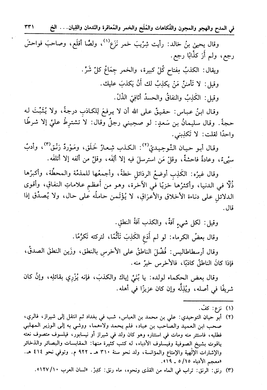 وقال أبو حيان التوحيدي : الكذب شعارٌ خلق ، وموردٌ رنق ، وأدبٌ سيء ، وعادةٌ فاحشةٌ ، وقل من استرسل فيه إلا ألفه ، وقل من ألفه إلا أتلفه .