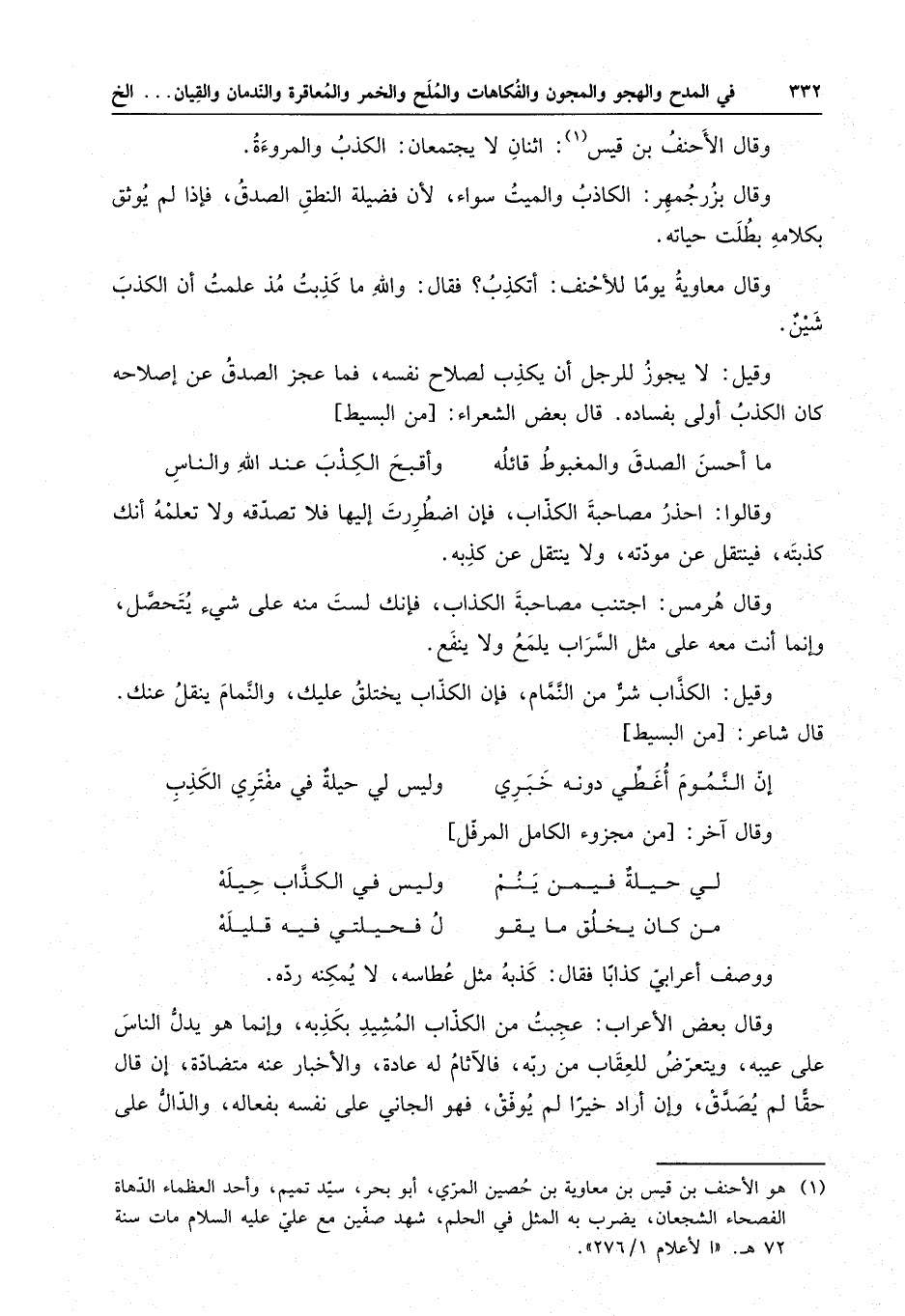 وقال معاوية يوما للأحنف : أتكذب ؟ فقال : والله ما كذبت مذ علمت أن الكذب شينٌ .