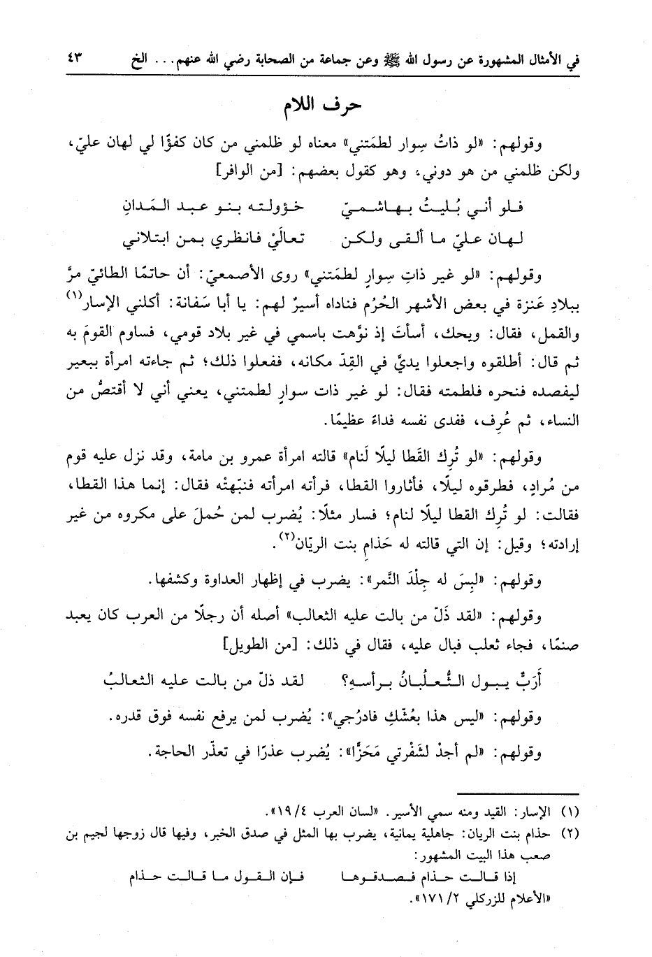 قولهم : " لو ذات سوار لطمتني " : معناه لو ظلمني من كان كفؤا لي لهان علي ، ولكن ظلمني من هو دوني ، وهو كقول بعضهم :
