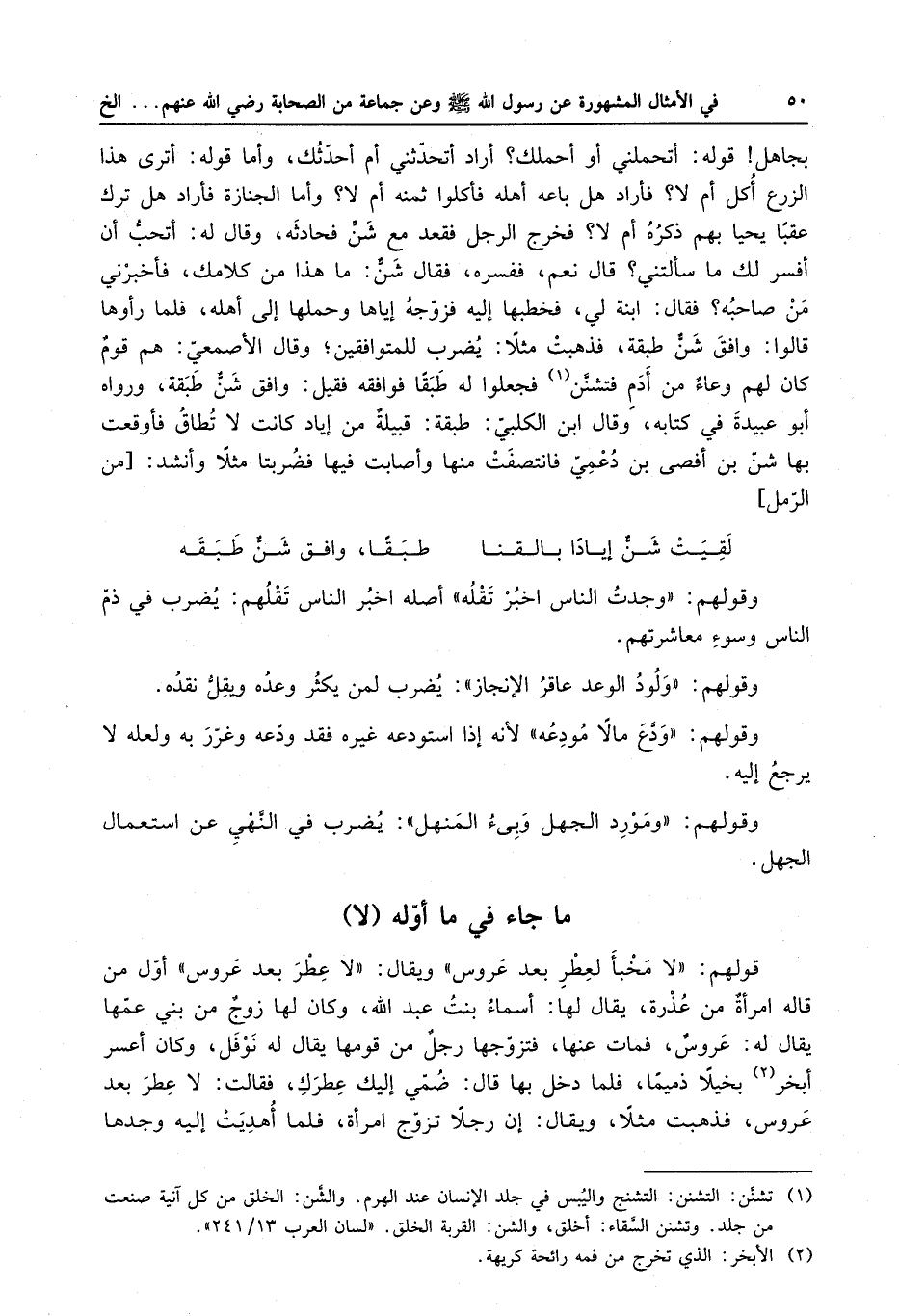 بجاهل ؟ قوله : اتحملني أو أحملك ؟ أراد أتحدثني أم أحدثك ، وأما قوله : أترى هذا الزرع أكل أم لا ؟ فأراد هل باعه أهله فأكلوا ثمه أم لا ؟ وأما الجنازة فأراد هل ترك عقبا يحيا بهم ذكره أم لا ؟ فخرج الرجل فقعد مع شنٌّ فحادثه ، وقال له : أتحب أن أفسر لك ما سألتني ؟ قال نعم ، ففسره فقال شنٌّ : ما هذا من كلامك ، فأخبرني من صاحبه ؟ فقال : ابنة لي ، فخطبها إليه فزوجه إياها وحملها إلى أهله ، فلما رأوها قالوا : وافق شنٌ طبقة ، فذهبت مثلا : يضرب للمتوافقين ، وقال الأصمعي : هم وقم كان لهم وعاء من أدمٍ فتشنن فجعلوا له طبقا فوافقه فقيل : وافق شنٌّ طبقه ، ورواه أبو عبيدة في كتابه ، وقال ابن الكلبي : طبقة : قبيلةٌ من إياد كانت لا تطاق فأوقعت بها شن بن أفصى بن دعمي ، فانتصفت منها وأصابت فيها فضربتا مثلا وأنشد .