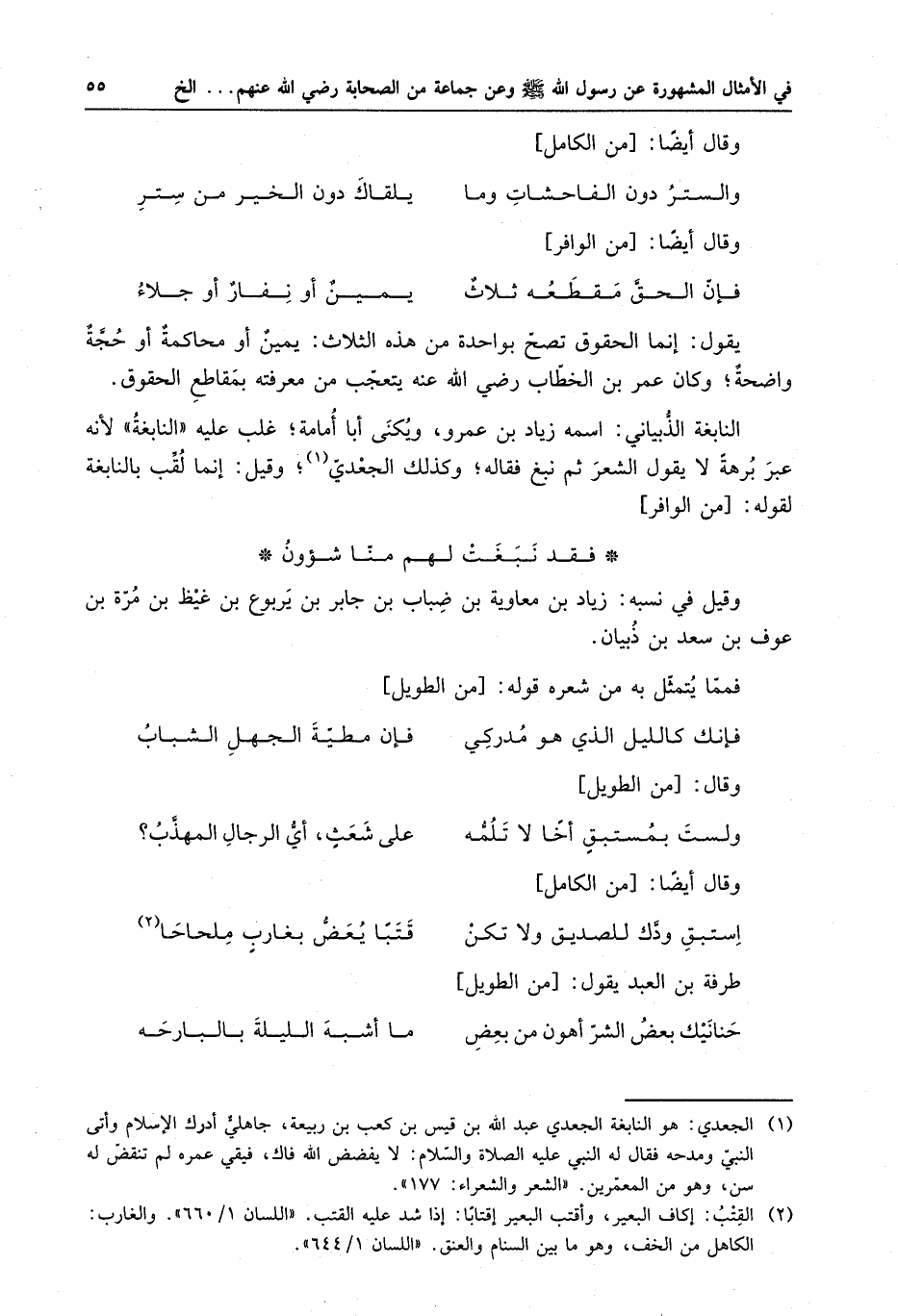 النابغة الذبياني : اسمه زياد بن عمرو ، ويكنى أبا أمامة ، غلب عليه النابغة لأنه عبر برهةً لا يقول الشعر ثم نبغ فقاله ، وكذلك الجعدي ، وقيل : إنما لقب بالنابغة لقوله :