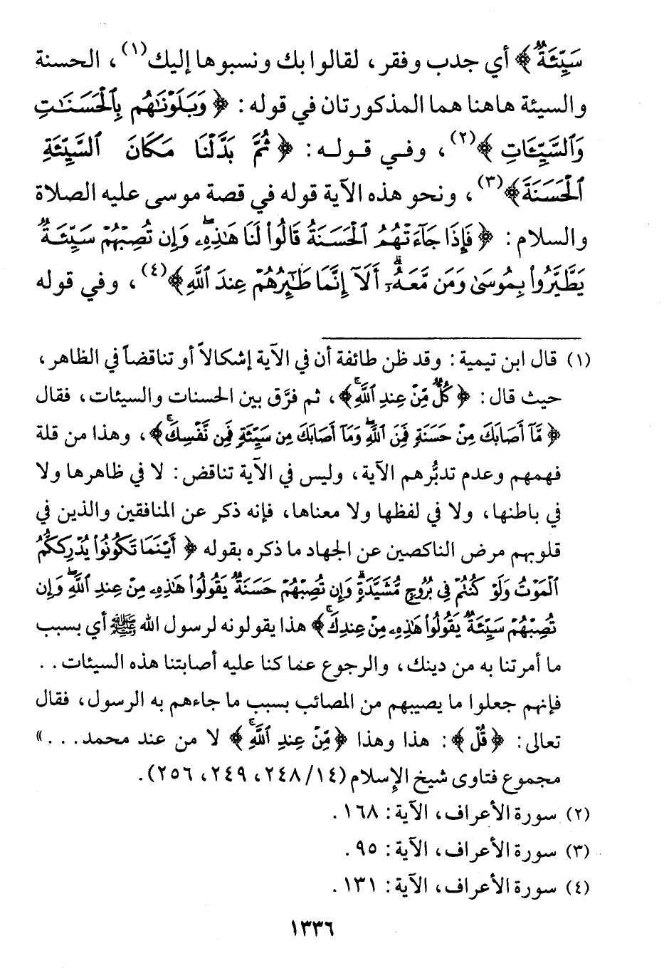 الحسنةِ والسيئة هاهنا هما المذكورتان في قوله: (وَبَلَوْنَاهُمْ بِالْحَسَنَاتِ وَالسَّيِّئَاتِ)، وفي قوله: (ثُمَّ بَدَّلْنَا مَكَانَ السَّيِّئَةِ الْحَسَنَةَ).