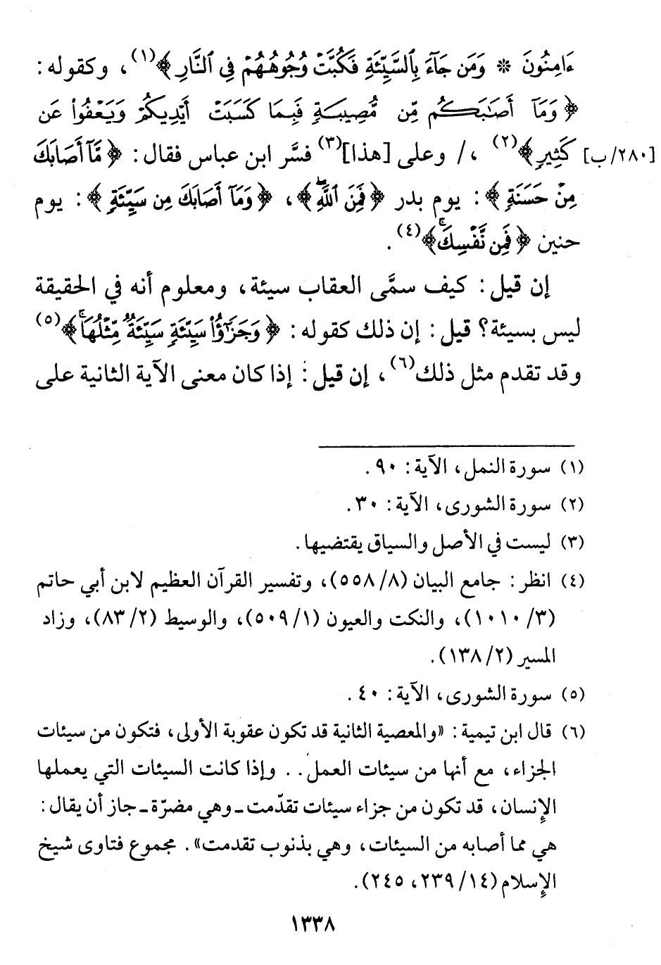وكقوله: (وَمَا أَصَابَكُمْ مِنْ مُصِيبَةٍ فَبِمَا كَسَبَتْ أَيْدِيكُمْ وَيَعْفُو عَنْ كَثِيرٍ)، وعلى هذا فسَّر ابن عباس فقال: (مَا أَصَابَكَ مِنْ حَسَنَةٍ): يوم بدر (فَمِنَ اللَّهِ)، (وَمَا أَصَابَكَ مِنْ سَيِّئَةٍ): يوم حنين (فَمِنْ نَفْسِكَ).