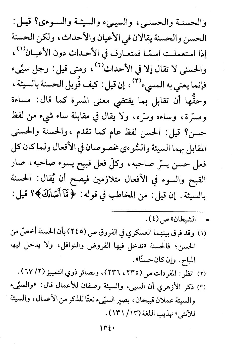 القبح والسوء في الأفعال متلازمين فيصح أن يُقال: الحسنة بالسيئة.