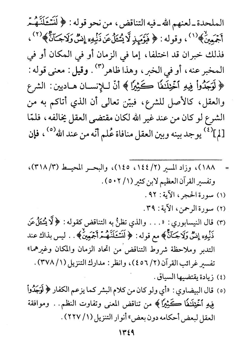 ادعت الملحدة - لعنهم الله - فيه التناقض، من نحو قوله: (لَنَسْأَلَنَّهُمْ أَجْمَعِينَ)، وقوله: (فَيَوْمَئِذٍ لَا يُسْأَلُ عَنْ ذَنْبِهِ إِنْسٌ وَلَا جَانٌّ).