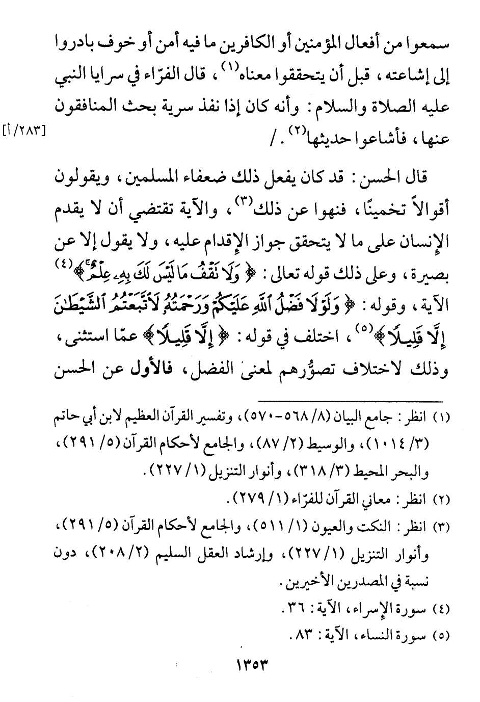 الآية، وقوله: (وَلَوْلَا فَضْلُ اللَّهِ عَلَيْكُمْ وَرَحْمَتُهُ لَاتَّبَعْتُمُ الشَّيْطَانَ إِلَّا قَلِيلًا)، اختلف في قوله: (إِلَّا قَلِيلًا) عمّا استثنى، وذلك لاختلاف تصوُّرهم لمعنى الفضل، فالأول عن الحسن