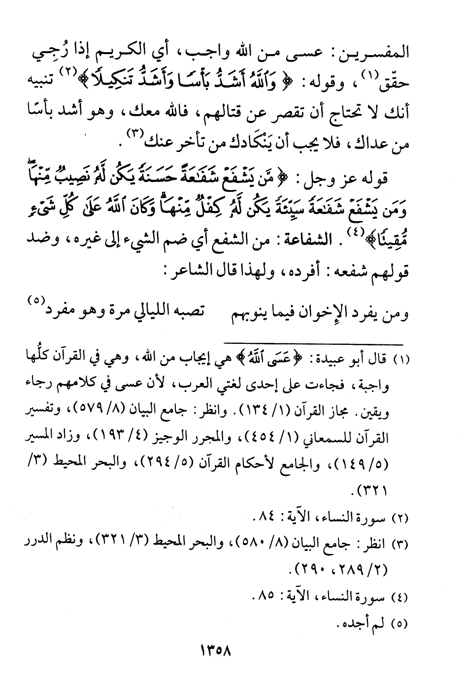 قوله عز وجل: (مَنْ يَشْفَعْ شَفَاعَةً حَسَنَةً يَكُنْ لَهُ نَصِيبٌ مِنْهَا وَمَنْ يَشْفَعْ شَفَاعَةً سَيِّئَةً يَكُنْ لَهُ كِفْلٌ مِنْهَا وَكَانَ اللَّهُ عَلَى كُلِّ شَيْءٍ مُقِيتًا (85)