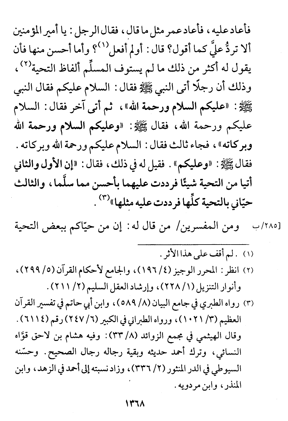 قال: أو لم أفعل؟ وأما أحسن منها فأن يقول له أكثر من ذلك ما لم يستوف المسلِّم ألفاظ التحية، وذلك أن رجلًا أتى النبي - صلى الله عليه وسلم - فقال: السلام عليكم فقال النبي - صلى الله عليه وسلم -: