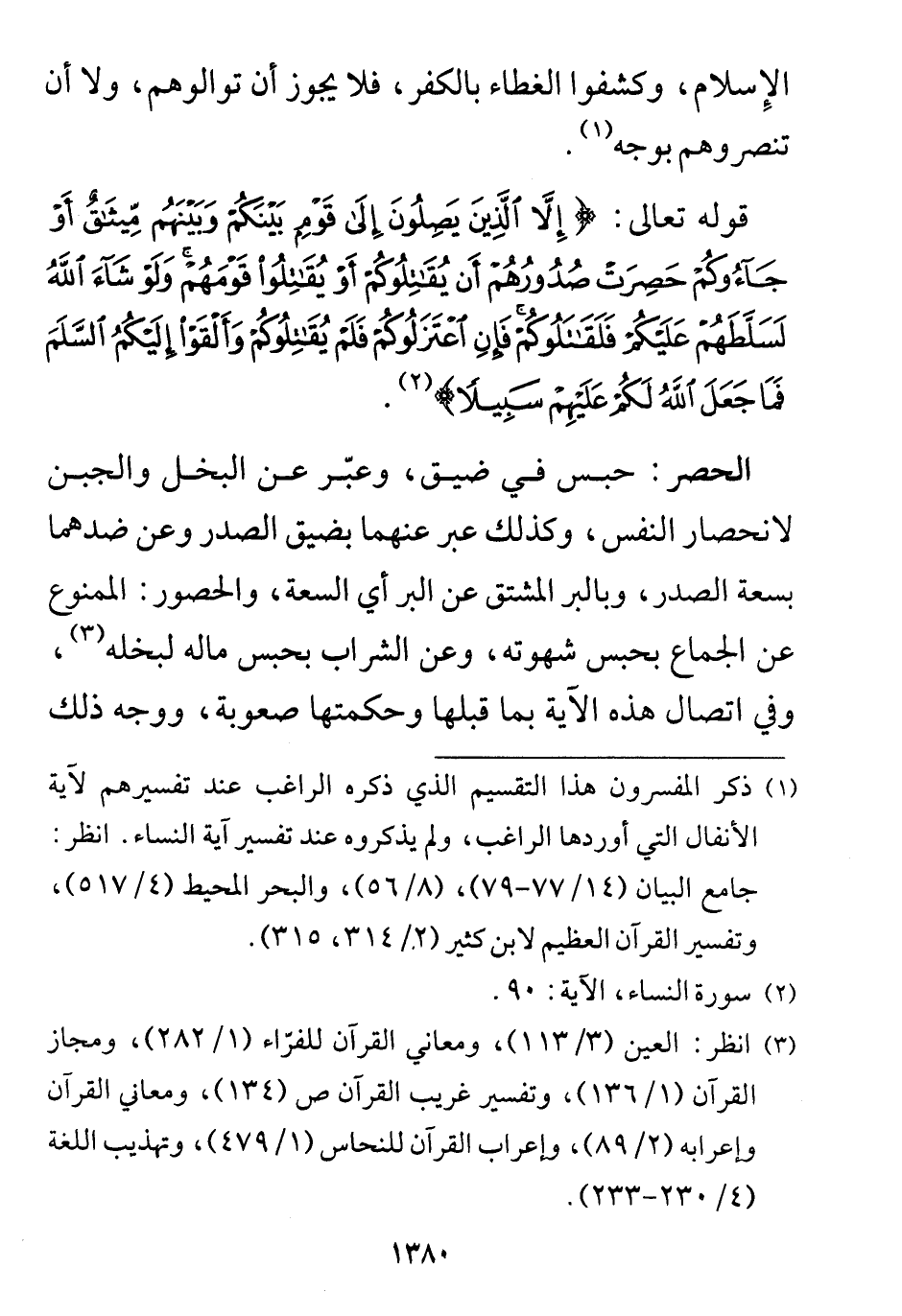 قوله تعالى: (إِلَّا الَّذِينَ يَصِلُونَ إِلَى قَوْمٍ بَيْنَكُمْ وَبَيْنَهُمْ مِيثَاقٌ أَوْ جَاءُوكُمْ حَصِرَتْ صُدُورُهُمْ أَنْ يُقَاتِلُوكُمْ أَوْ يُقَاتِلُوا قَوْمَهُمْ وَلَوْ شَاءَ اللَّهُ لَسَلَّطَهُمْ عَلَيْكُمْ فَلَقَاتَلُوكُمْ فَإِنِ اعْتَزَلُوكُمْ فَلَمْ يُقَاتِلُوكُمْ وَأَلْقَوْا إِلَيْكُمُ السَّلَمَ فَمَا جَعَلَ اللَّهُ لَكُمْ عَلَيْهِمْ سَبِيلًا (90)