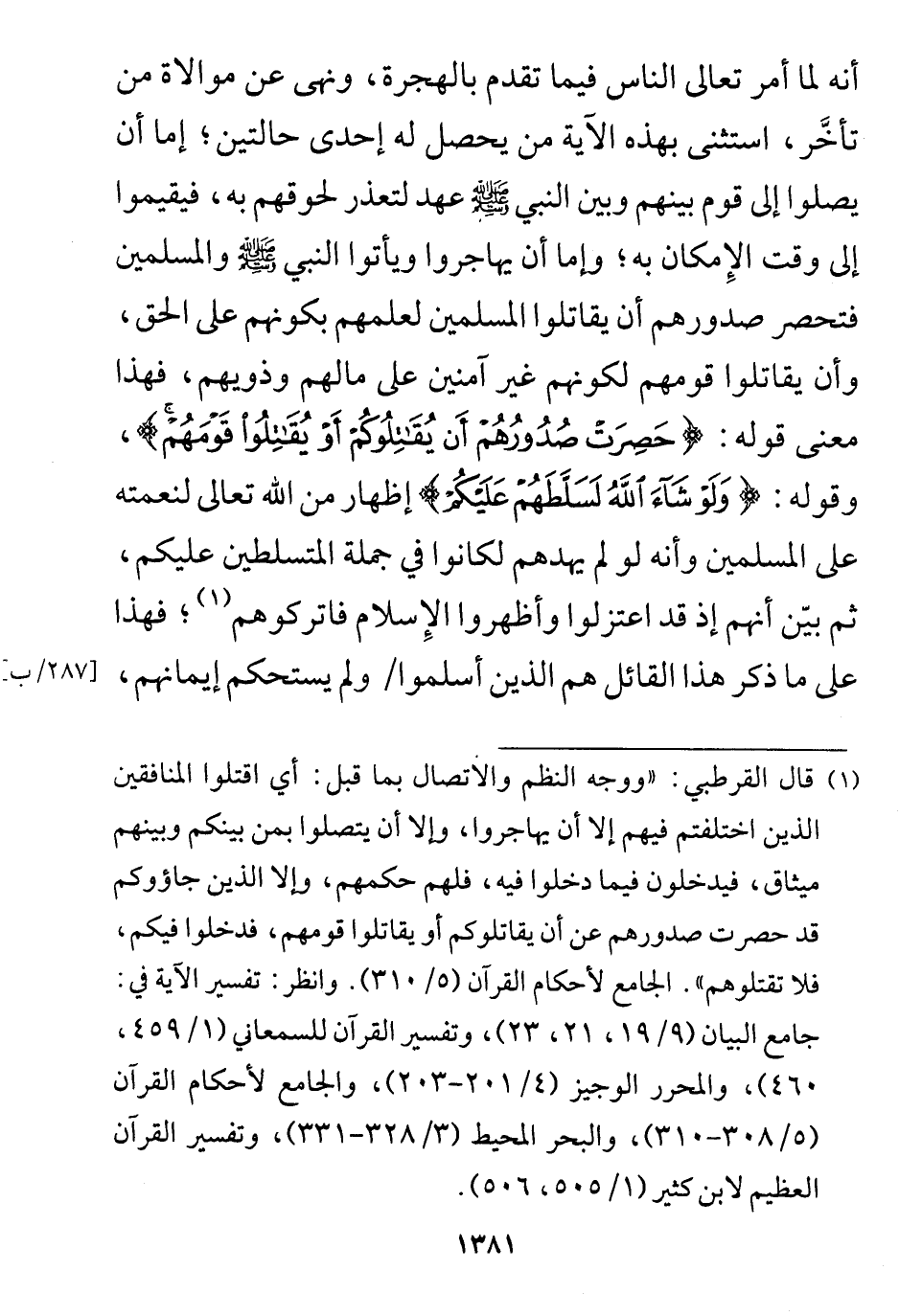 معنى قوله: (حَصِرَتْ صُدُورُهُمْ أَنْ يُقَاتِلُوكُمْ أَوْ يُقَاتِلُوا قَوْمَهُمْ).