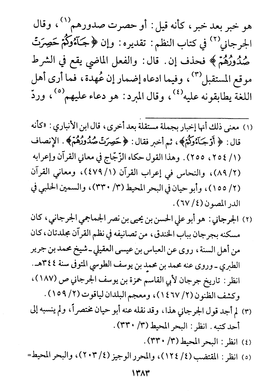 وقال الجرجاني في كتاب النظم: تقديره: وإن (جَاءُوكُمْ حَصِرَتْ صُدُورُهُمْ) فحذف إن.