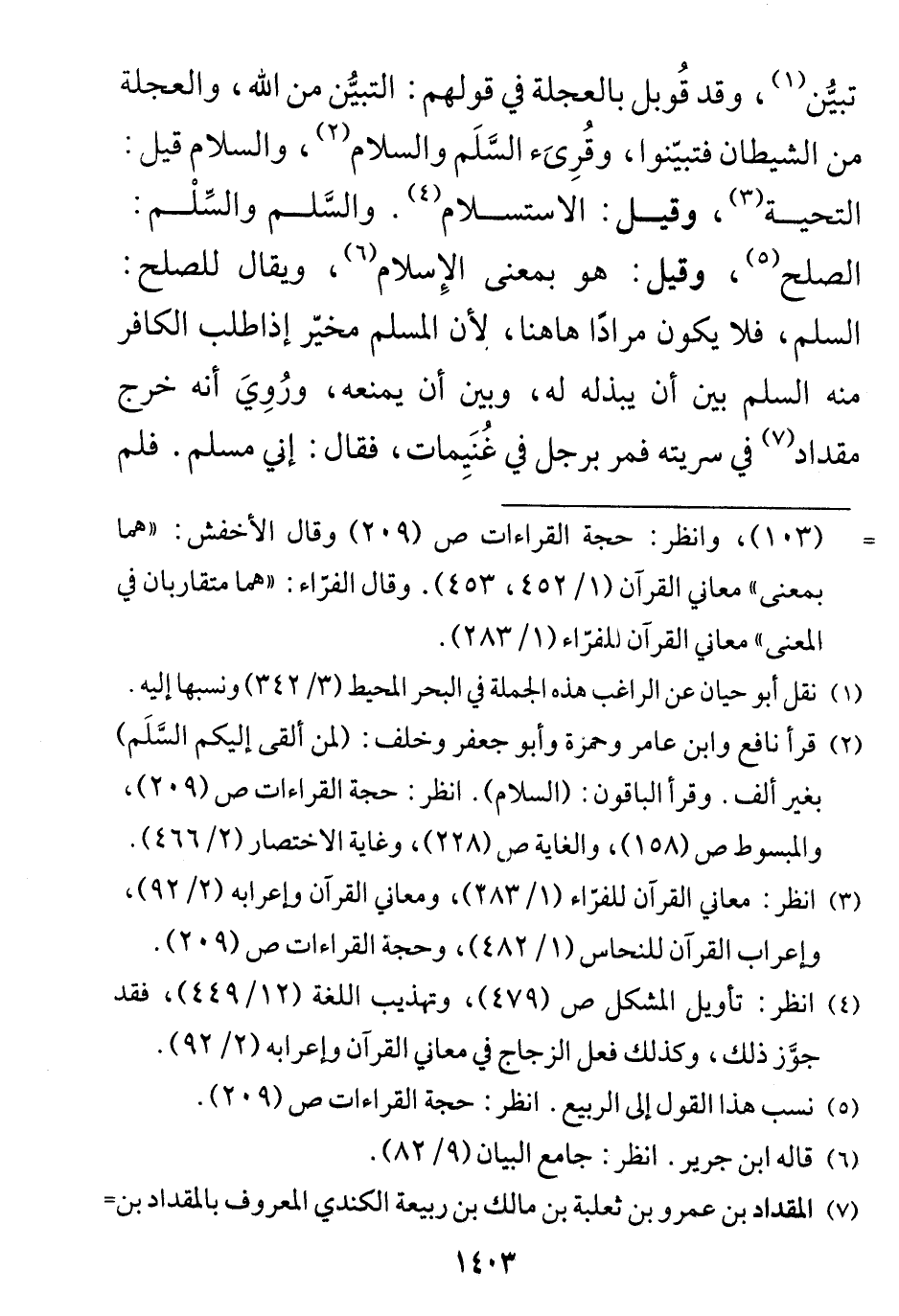 وقيل: هو بمعنى الإِسلام، ويقال للصلح: السلم، فلا يكون مرادًا هاهنا، لأن المسلم مخيّر إذا طلب الكافر منه السلم بين أن يبذله له، وبين أن يمنعه، ورُوِيَ أنه خرج مقداد في سريته فمر برجل في غُنَيِمات، فقال: إني مسلم.