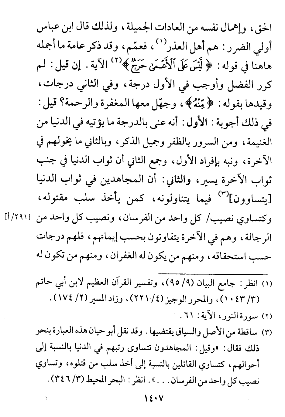 ولذلك قال ابن عباس أولي الضرر: هم أهل العذر، فعمَّم.